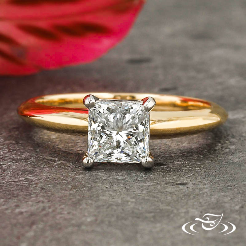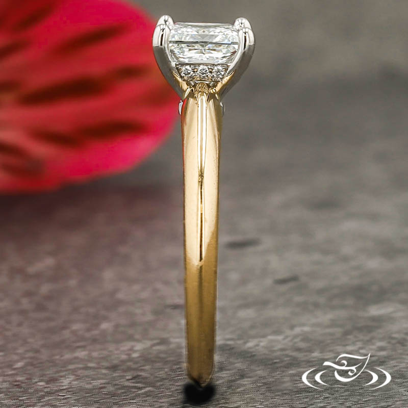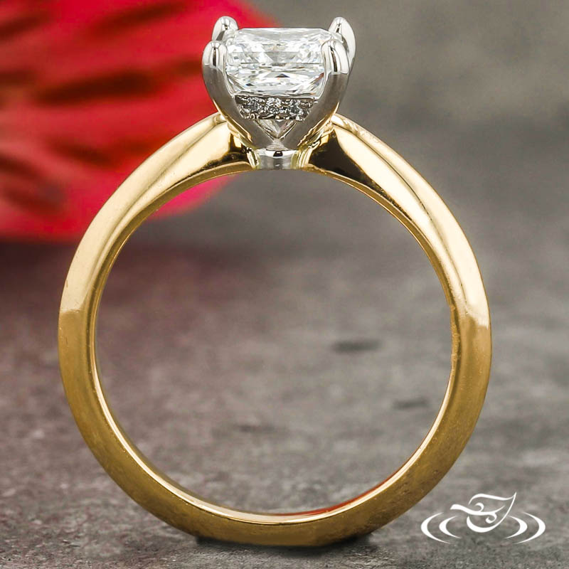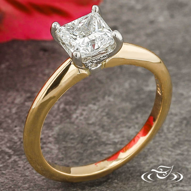 Custom 2 tone platinum and gold ring holding GLJW provided Princess Shape Lab Diamond. This ring also features a hidden halo with (12) lab diamonds around the center. This ring also has a high polish finish.