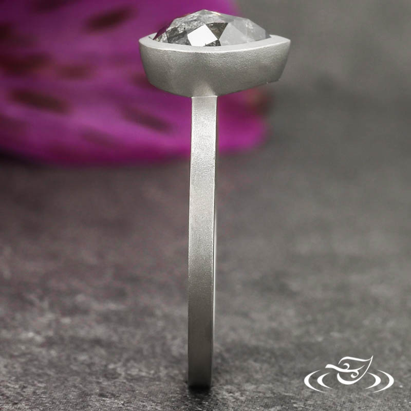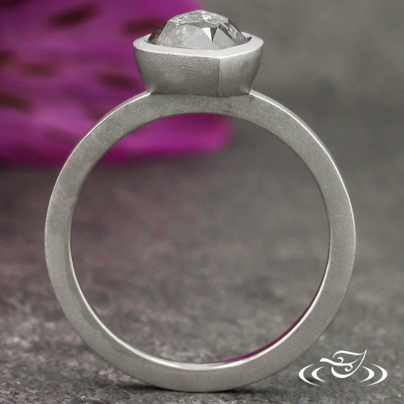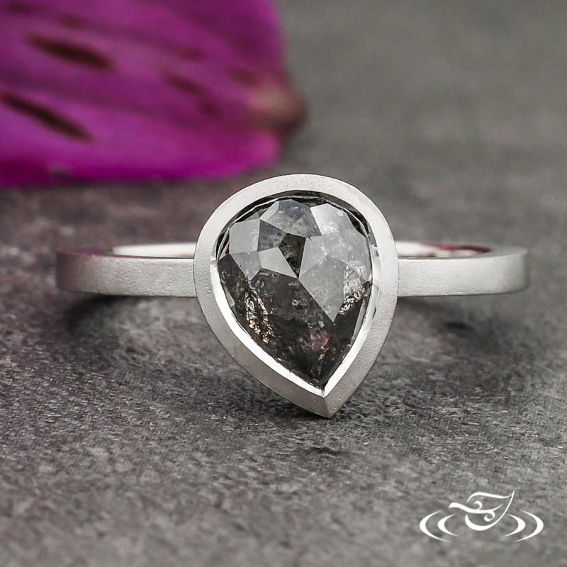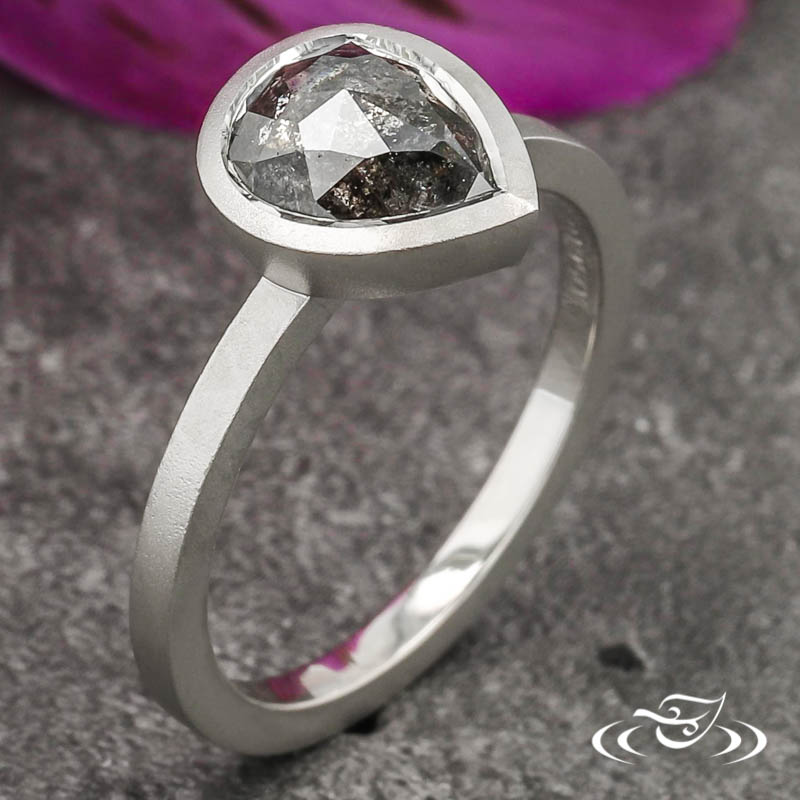 Custom Remake: 950 Platinum solitaire ring holding (1) previously purchased pear shaped rose cut salt & pepper diamond center stone bezel set at a slight angle with a flat top face to the bezel. The remainder of the ring is comprised of a round shank with a flat profile. All with a sandblasted finish.