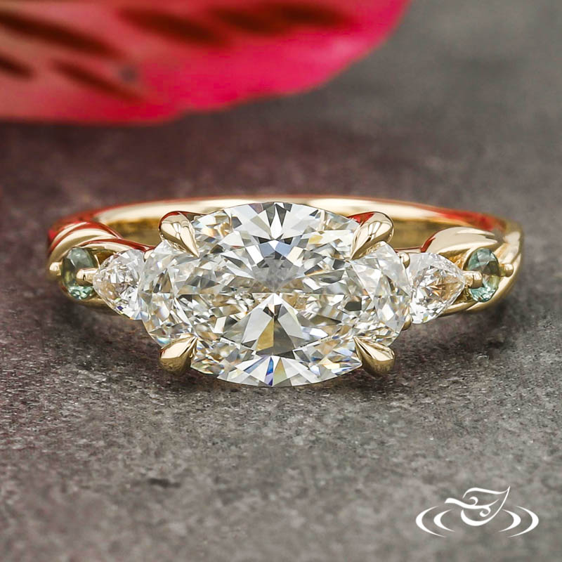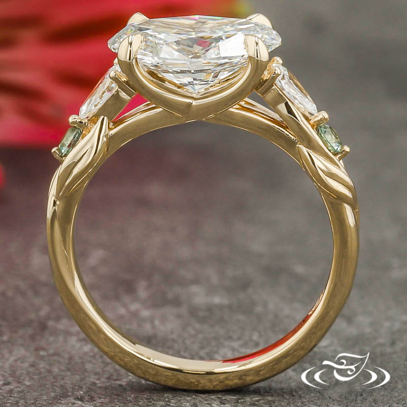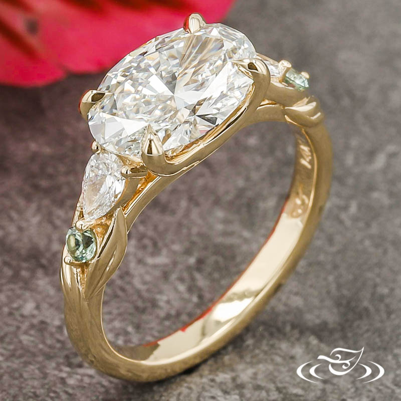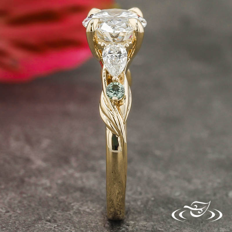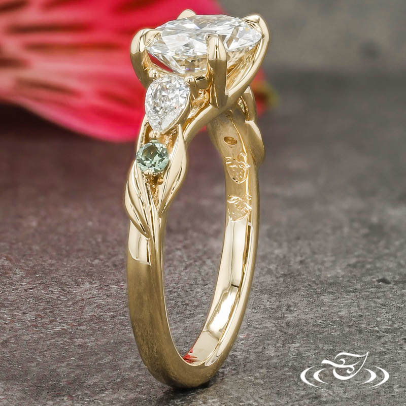 Custom 14kt yellow gold ring with a trellis style center setting holding (1) previously purchased oval cut lab diamond center stone 4-prong set lengthwise from each to west with delicate claw prongs. Each shoulder holds (1) prong set GLJW provided pear cut lab diamond inner accent stone and (1) prong set GLJW provided round cut green sapphire outer accent stone. A cast-in-place leaf motif extends up both sides of the shank with hand engraved vein detailing on the leaves. This ring has a round shape and a high polish finish.