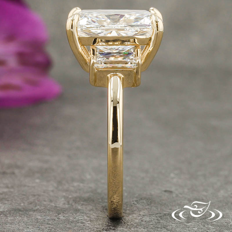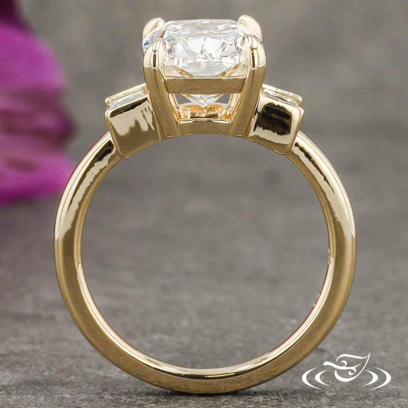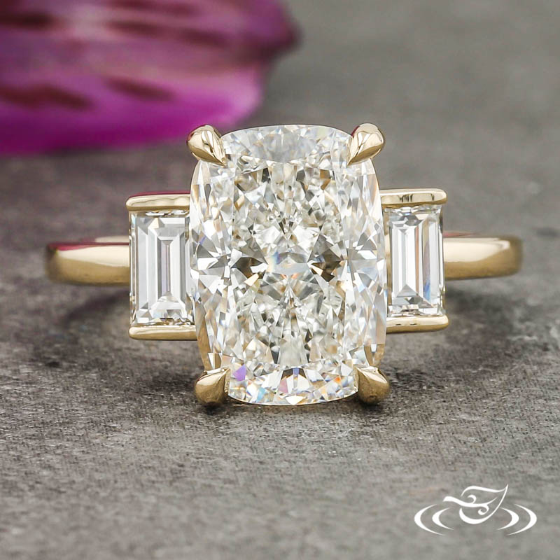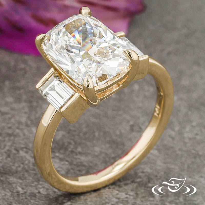 Custom 14kt yellow gold ring holding (1) 4-prong set GLJW provided elongated cushion cut lab diamond center stone. The center stone is flanked by (2) channel set GLJW provided baguette cut lab diamond side stones. This ring has a round shank and a bright high polish finish.