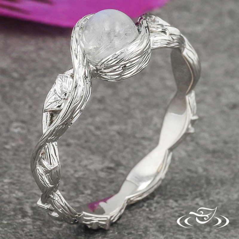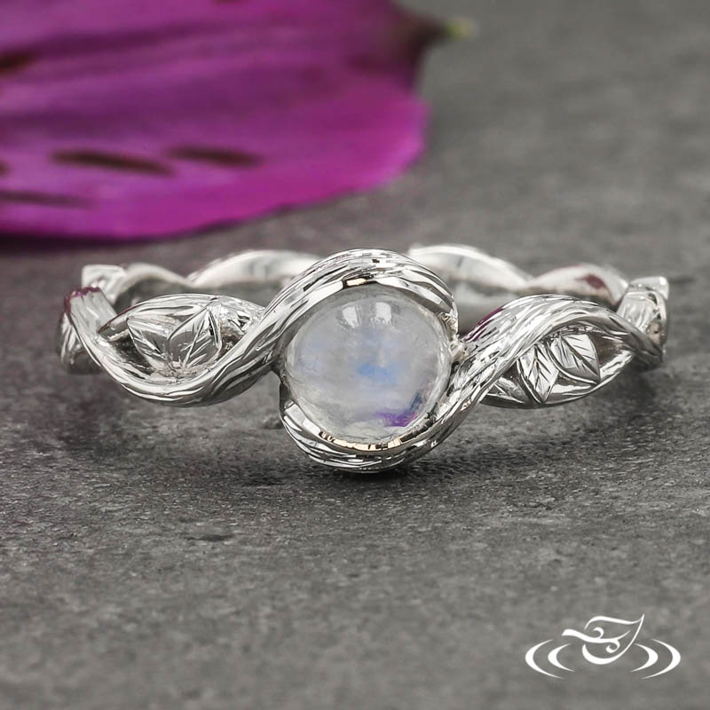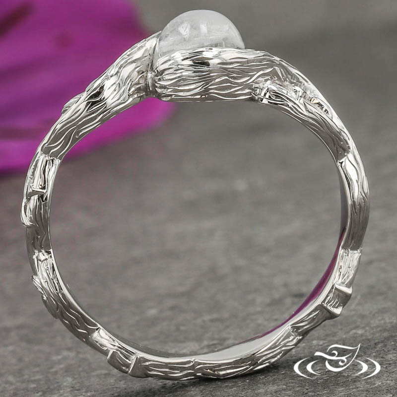 Custom 950 platinum ring holding a wrap set customer provided round Moonstone center. Hand engraved leaves and organic pattern. This ring also has a high polish finish.