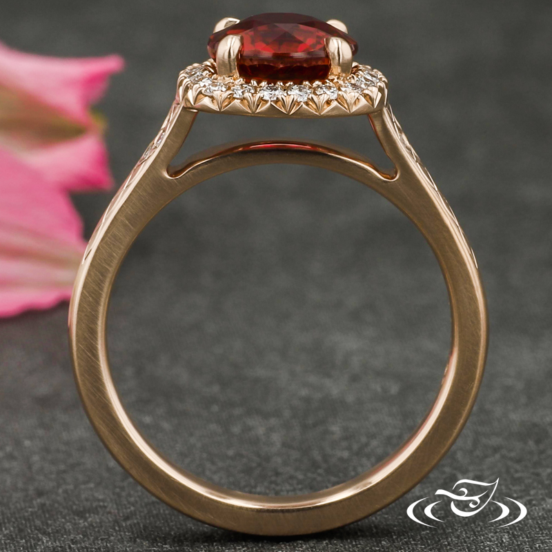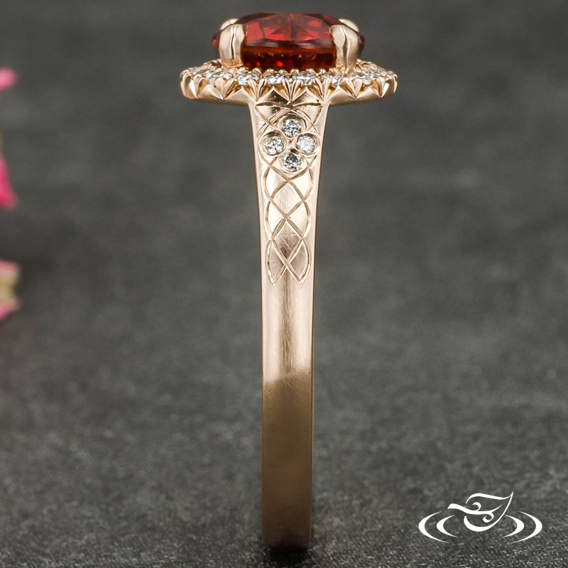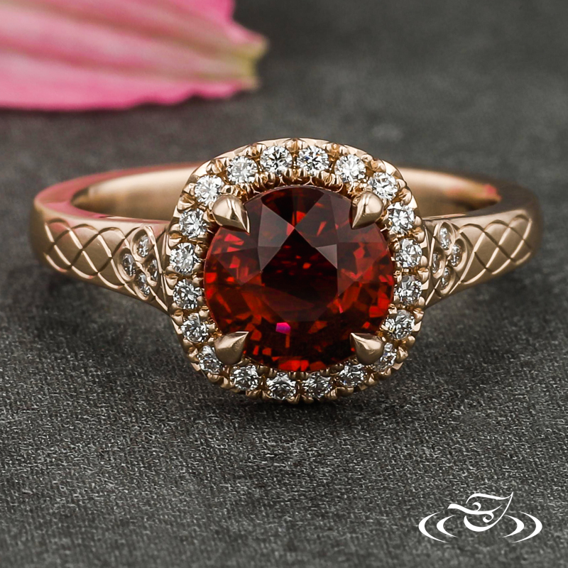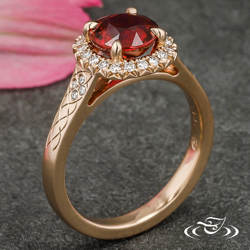 Custom 18kt rose gold halo style ring holding a 4-prong set customer provided round ruby center stone surrounded by (20) GLJW provided round diamonds French set in a halo, and (4) GLJW provided round diamonds flush set on either shoulder within a hand crafted celtic style engraving. This ring also has a round shank and a matte finish.