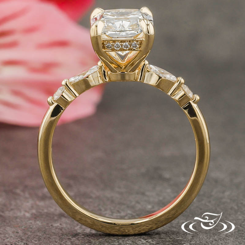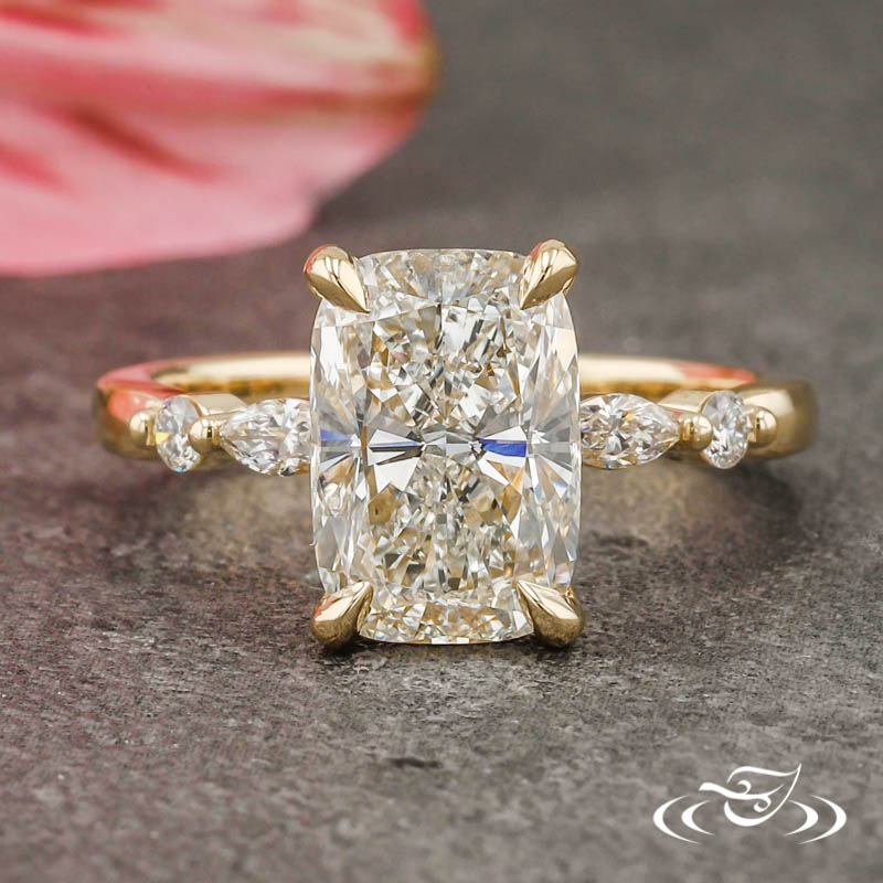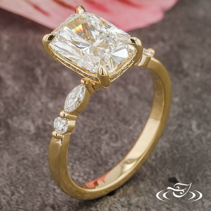 Custom 14kt yellow gold ring holding (1) GLJW provided elongated cushion cut lab diamond center stone 4-prong set with delicate pointed prongs. The center setting is accented by a bead set hidden halo of (22) GLJW provided round cut lab diamond melee. Each shoulder is also accented by a prong set GLJW provided marquise cut lab diamond inner accent stone and a prong set GLJW provided round cut lab diamond outer side stone. The remainder of the ring is comprised of a round domed shank. All with a high polish finish.