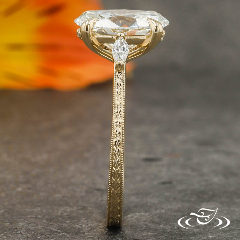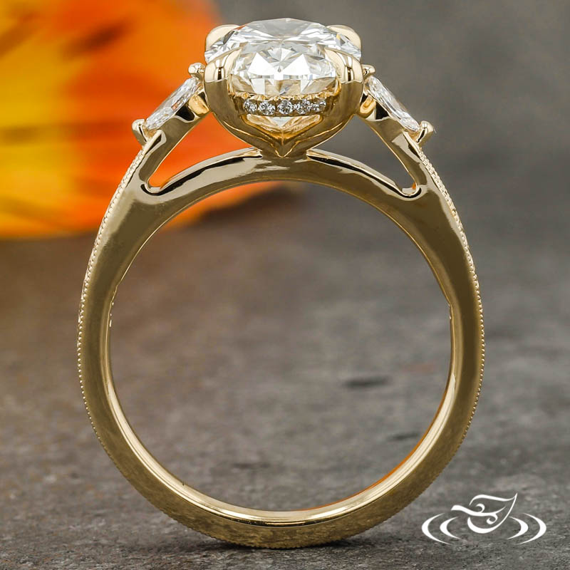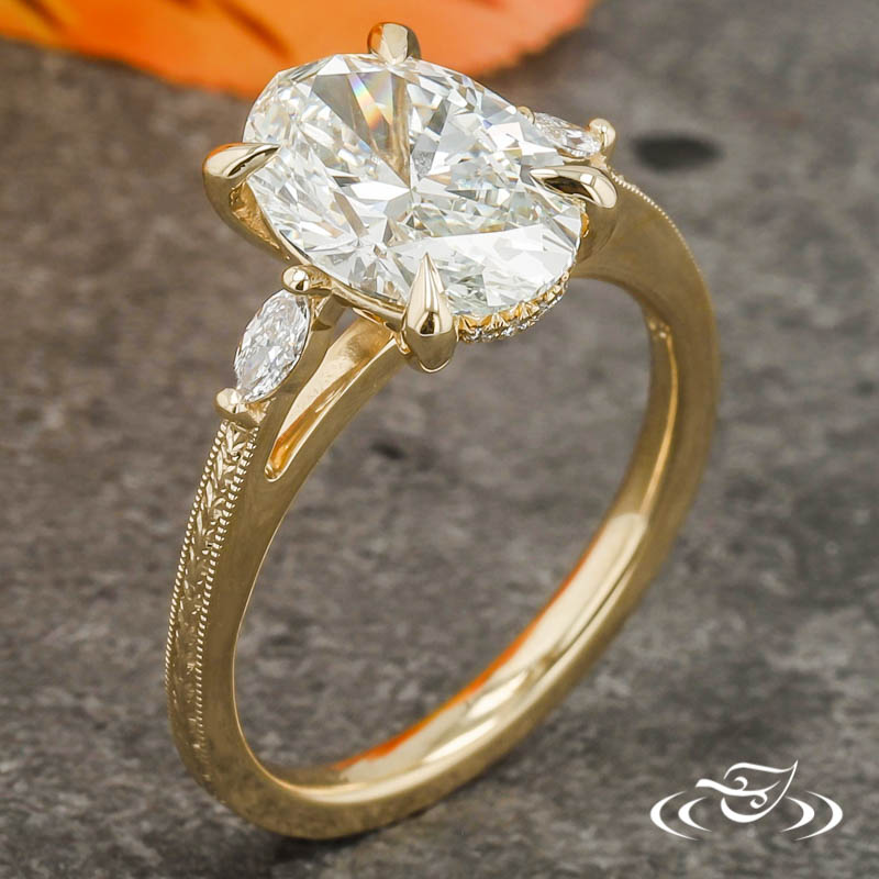 14k yellow gold ring featuring (1) GLJW provided oval lab diamond with hidden halo of GLJW provided french set lab diamond melee on north and south support bars. Each shoulder features (1) GLJW provided marquise lab diamond prong set. This ring also has a round, reverse tapered shank with hand engraved wheat pattern on top face framed by fine milgrain detailing. All with high polish finish.