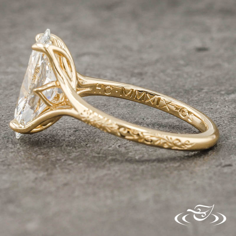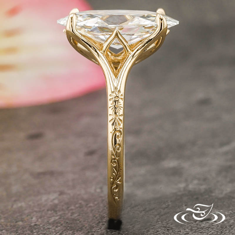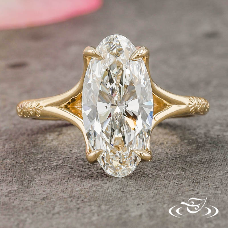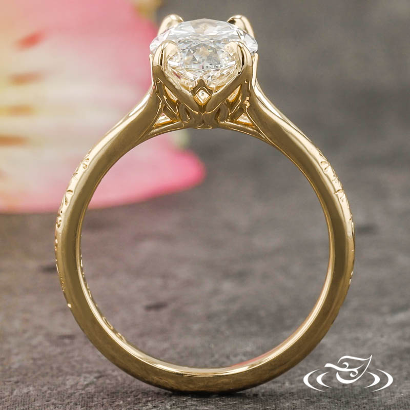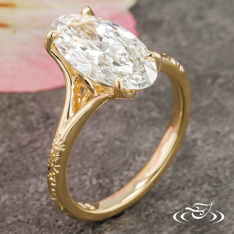 Custom 14kt yellow gold solitaire ring holding (1) 4-prong set elongated oval cut lab diamond center stone. The center setting has an intricate pierced petal basket under the center setting. The remainder of the ring is comprised of a round domed shank with split tapered shoulders. Hand engraved Henna inspired patterning extends partway down the top face. All with a high polish finish.