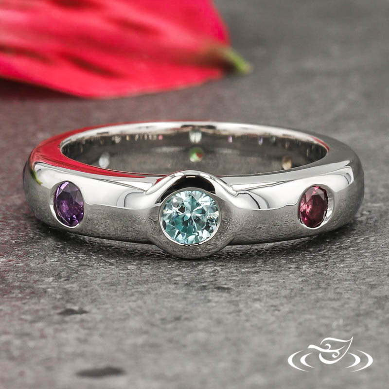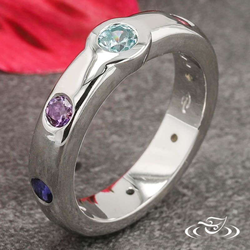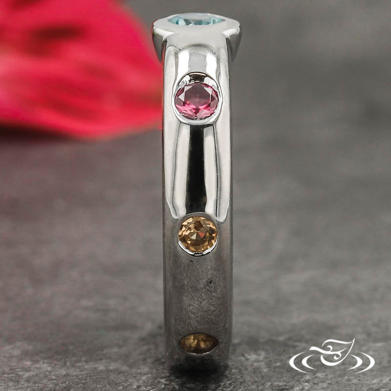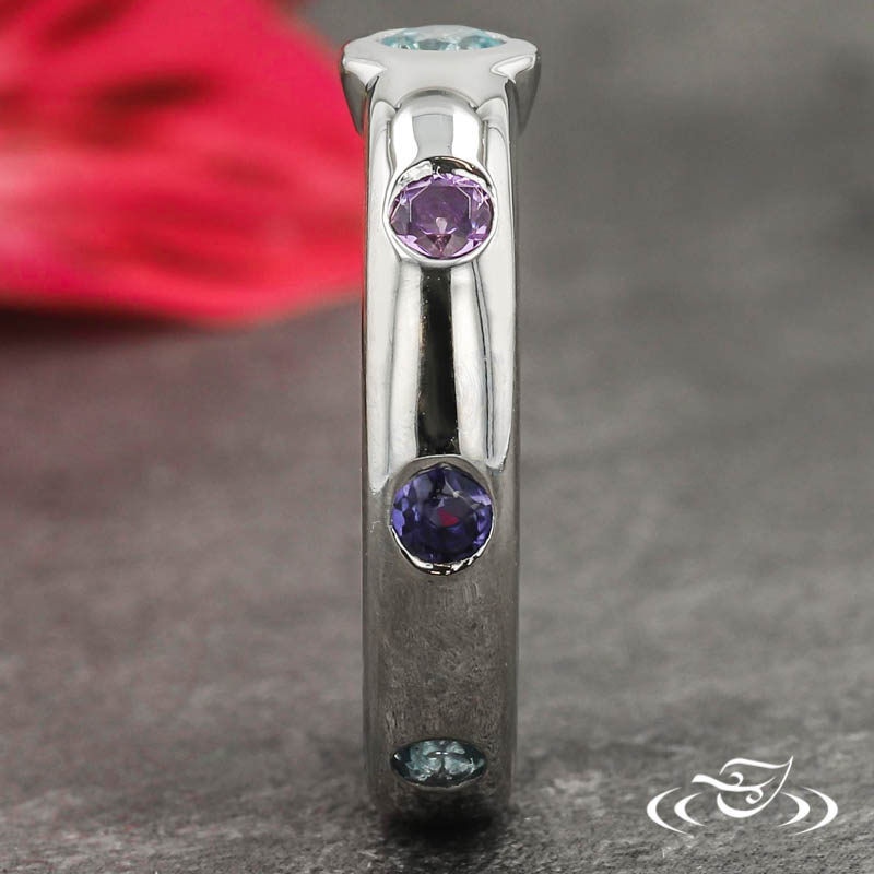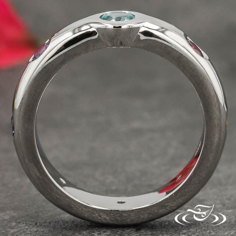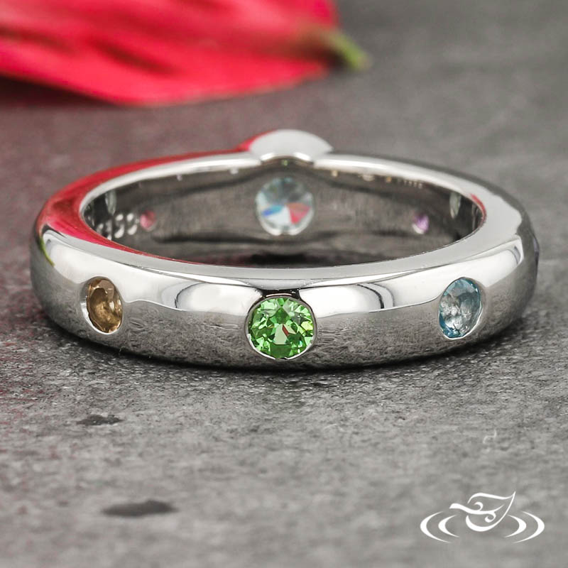 Custom 950 platinum ring with a round domed profile. At the top is (1) wider round detail holding (1) flush set customer provided round cut light blue stone. Around the remainder of the top face are an additional (7) customer provided round cut stones, of varying color, flush set with even spacing. All with a high polish finish.