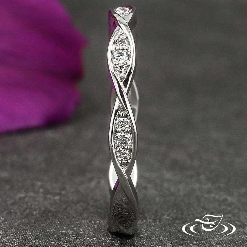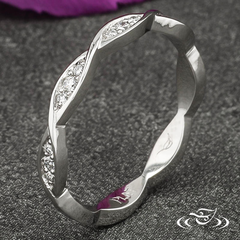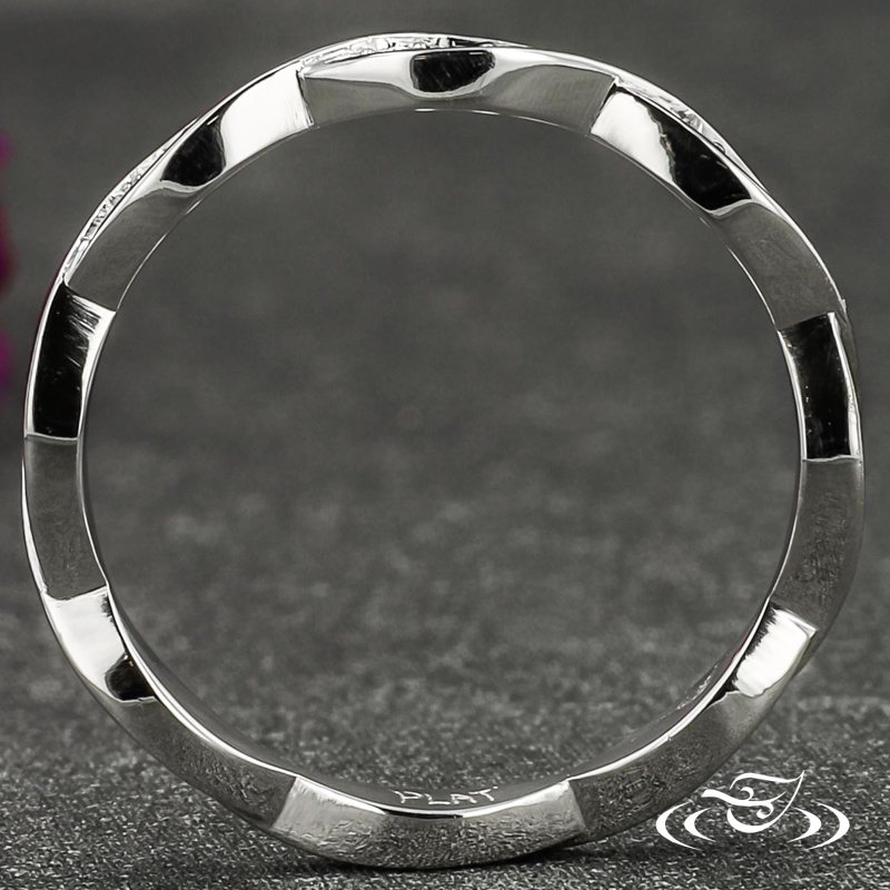 Custom 950 platinum band with round shank and high polish finish. Top face features marquise shaped twists eternity style, (5) of which each hold (3) GLJW provided round brilliant lab diamond melee bead set.