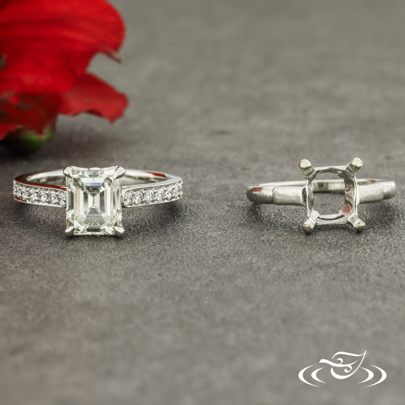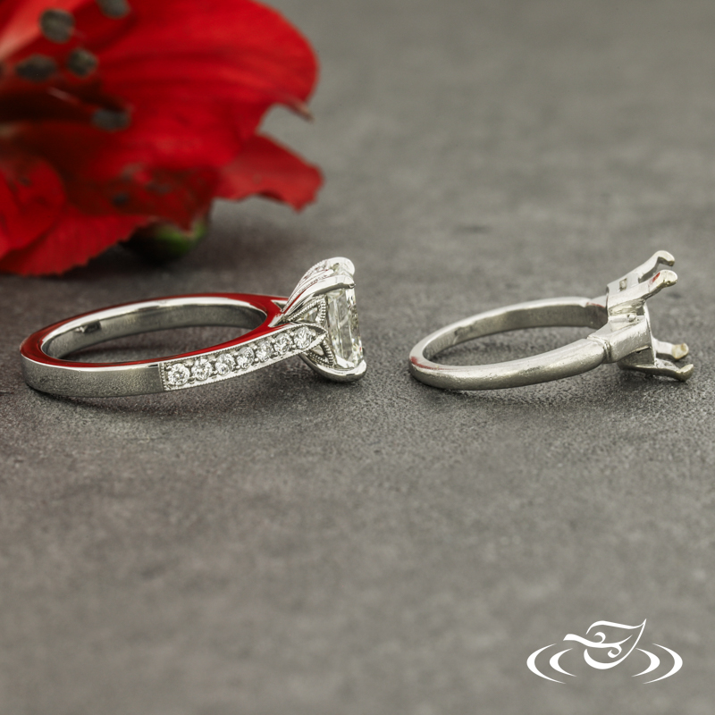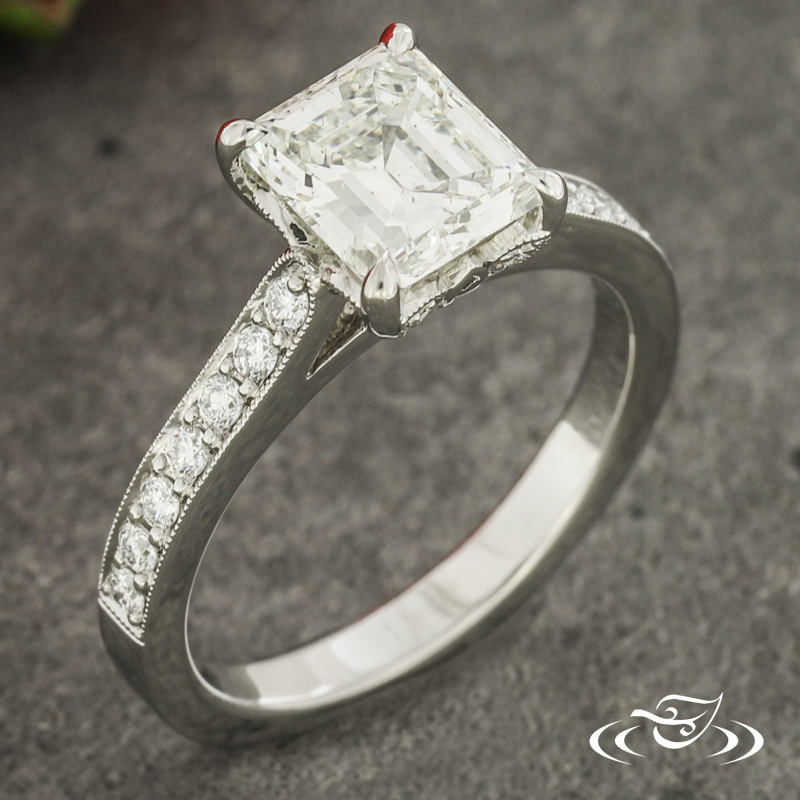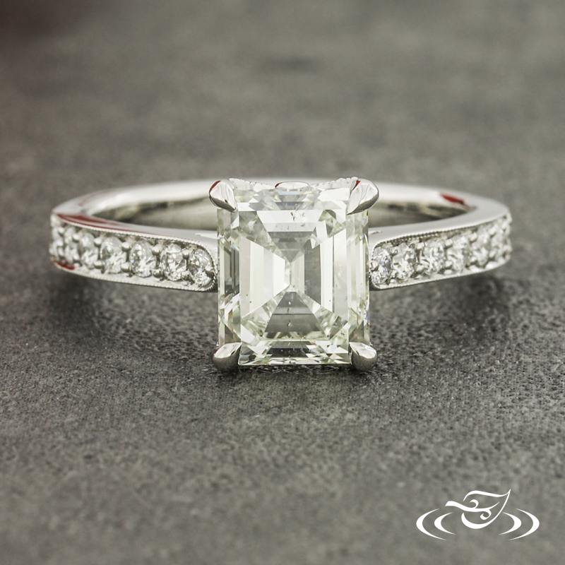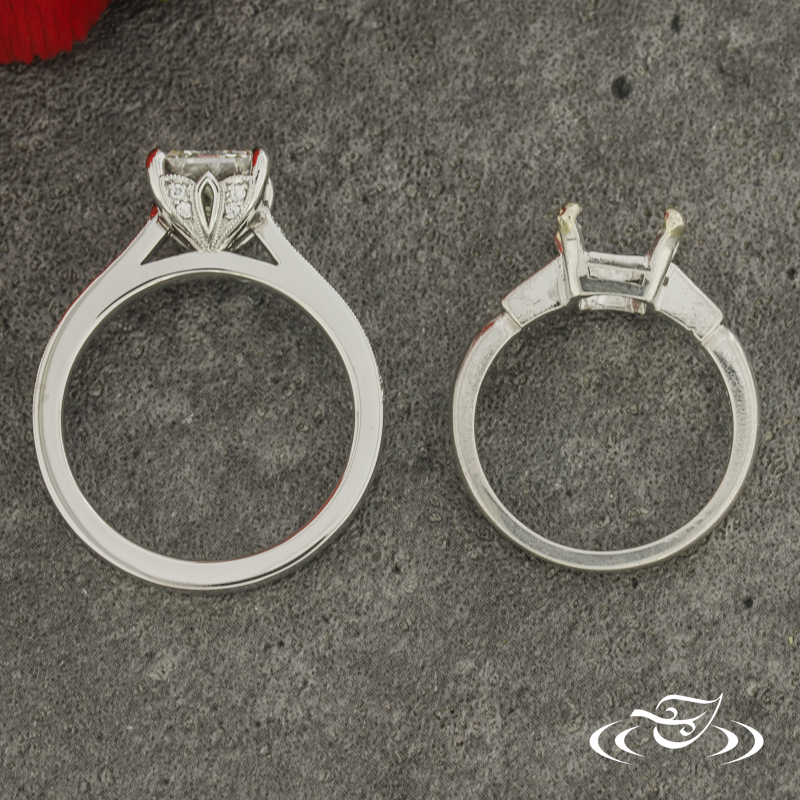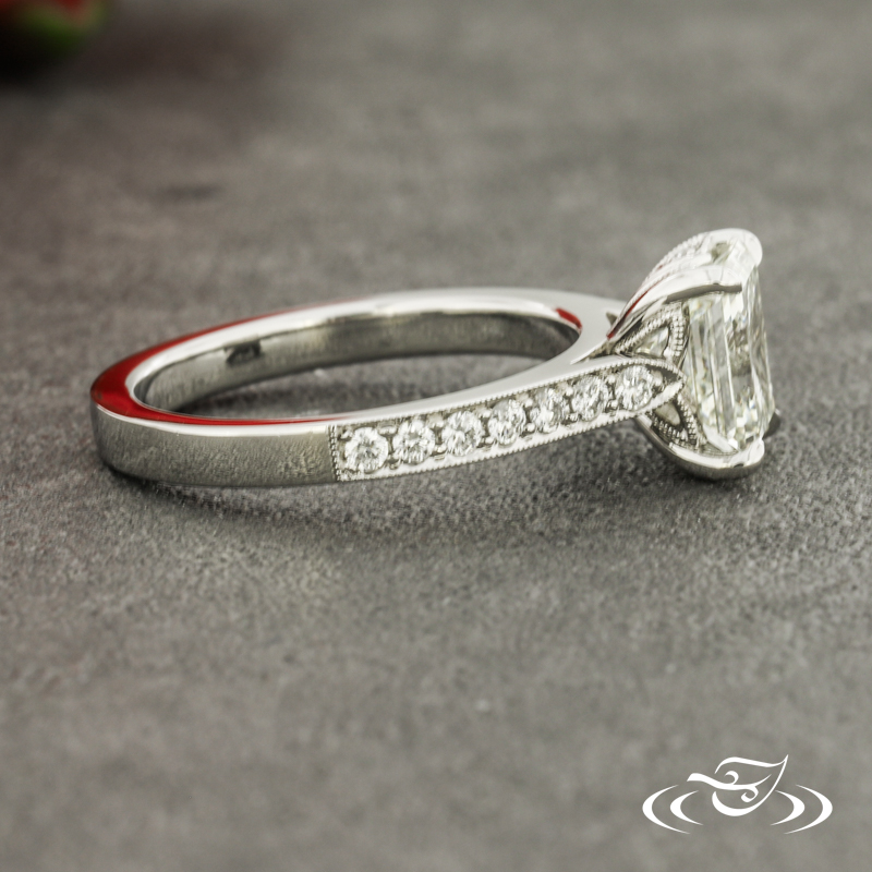 Custom 950 platinum ring holding (1) customer provided emerald cut diamond center stone 4-prong set with delicate claw prongs. The center setting is accented on the north and south side faces by GLJW provided round cut lab diamond melee bead set into the petal-like details. The round shank is accented with additional GLJW provided round cut lab diamond melee bead set along the top half. This ring is completed in a high polish with milgrain framing the bead set stones.
