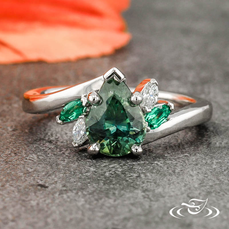 Custom 950 platinum ring holding (1) GLJW provided pear cut blue-green Montana sapphire center stone prong set with a chevron shaped prong on the pointed end and (4) round prongs on the sides. This ring has a wrap-like motif to the shank with (2) GLJW provided chevron prongs set melee on each shoulder, (1) marquise cut lab diamond and (1) marquise cut lab green emerald. All with a bright high polish finish.