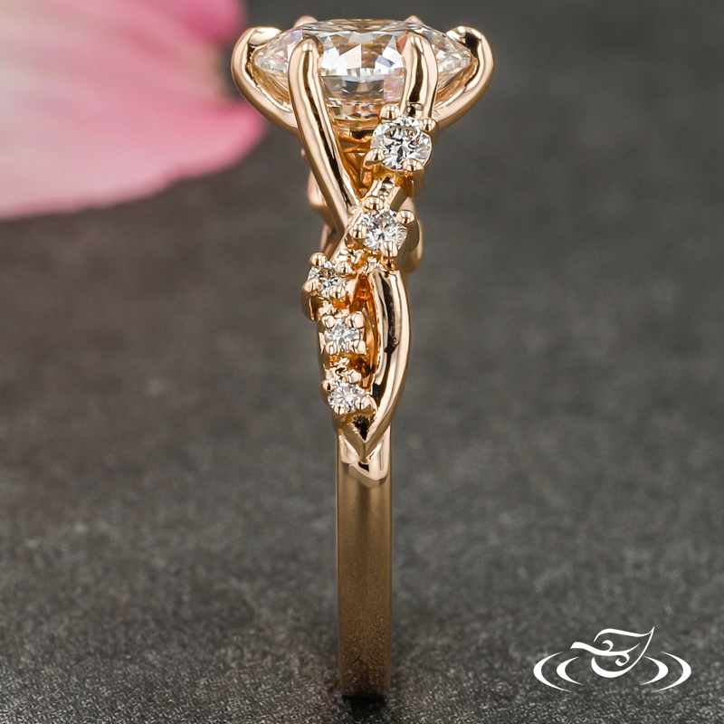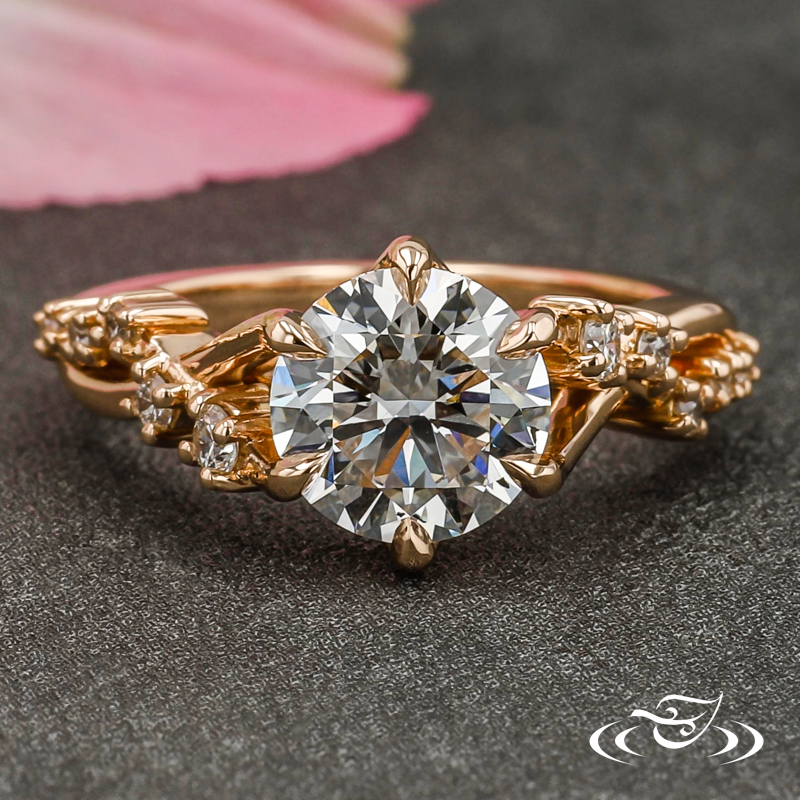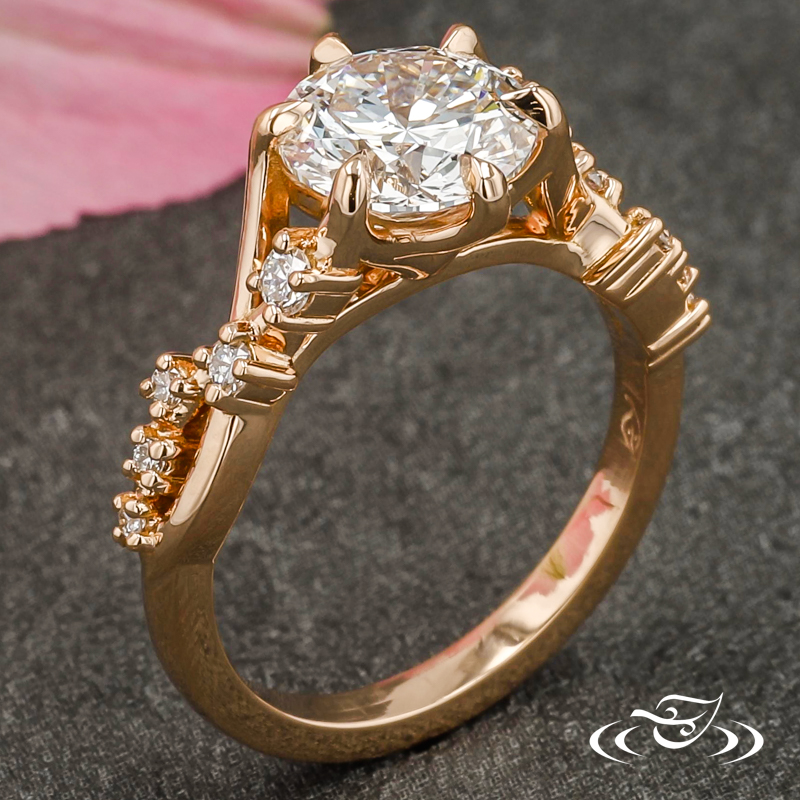 Custom 18k rose gold ring featuring (1) GLJW provided round brilliant diamond 6-prong set in pierced setting. Shoulders feature (2) pierced twists with GLJW provided round lab diamond melee 4-prong set on (1) twist. This ring also has a round shank, slightly domed profile, and high polish finish.