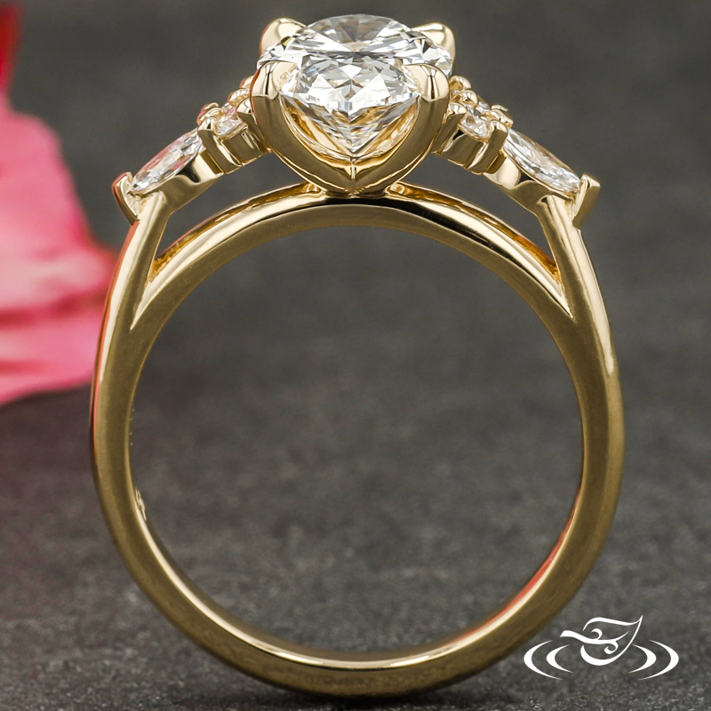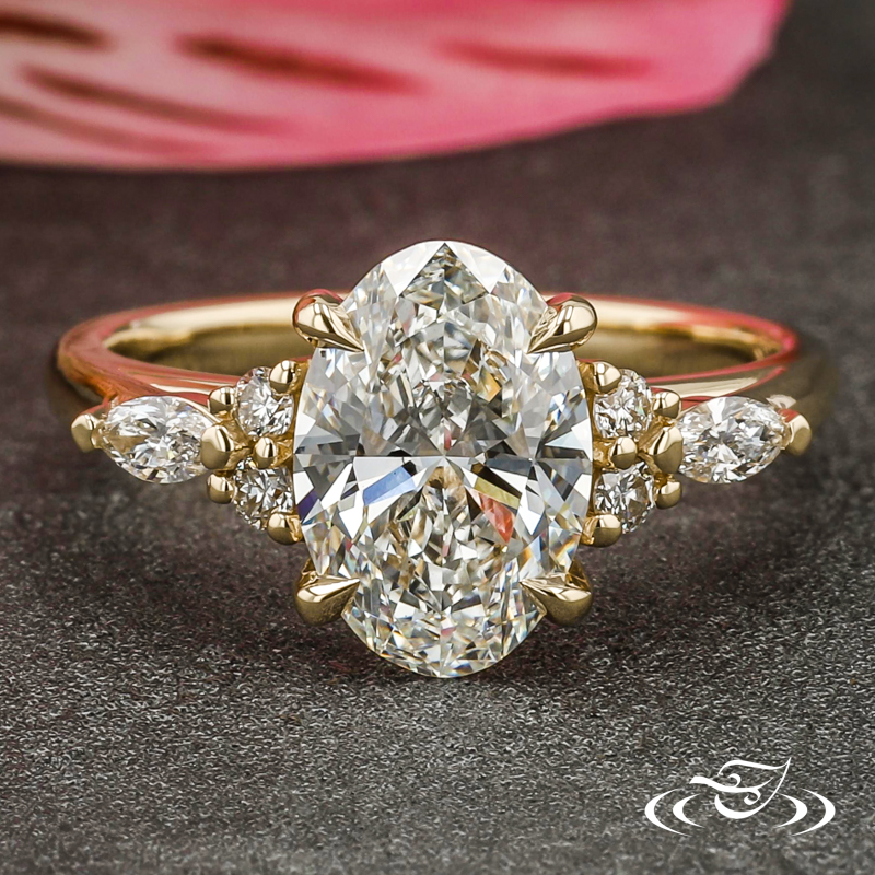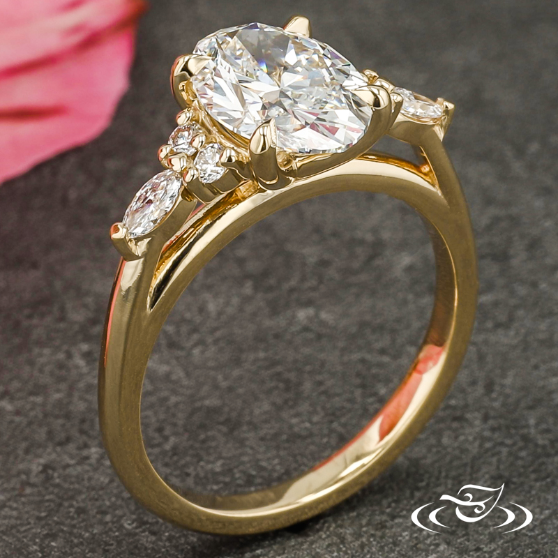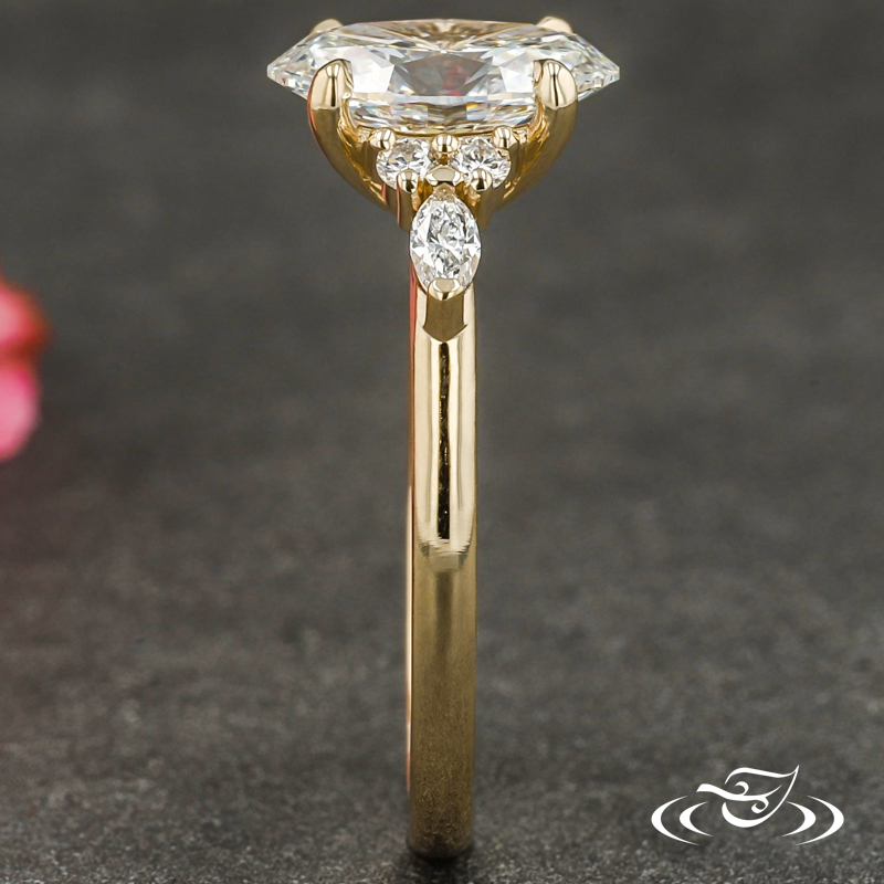 Custom 14kt yellow gold ring featuring (1) 4-prong set GLJW provided oval lab diamond center stone. Each shoulder features (2) GLJW provided round lab diamond melee followed by (1) GLJW provided marquise lab diamond melee, all prong set. This ring also has a round shank, slightly domed profile, and a high polish finish.