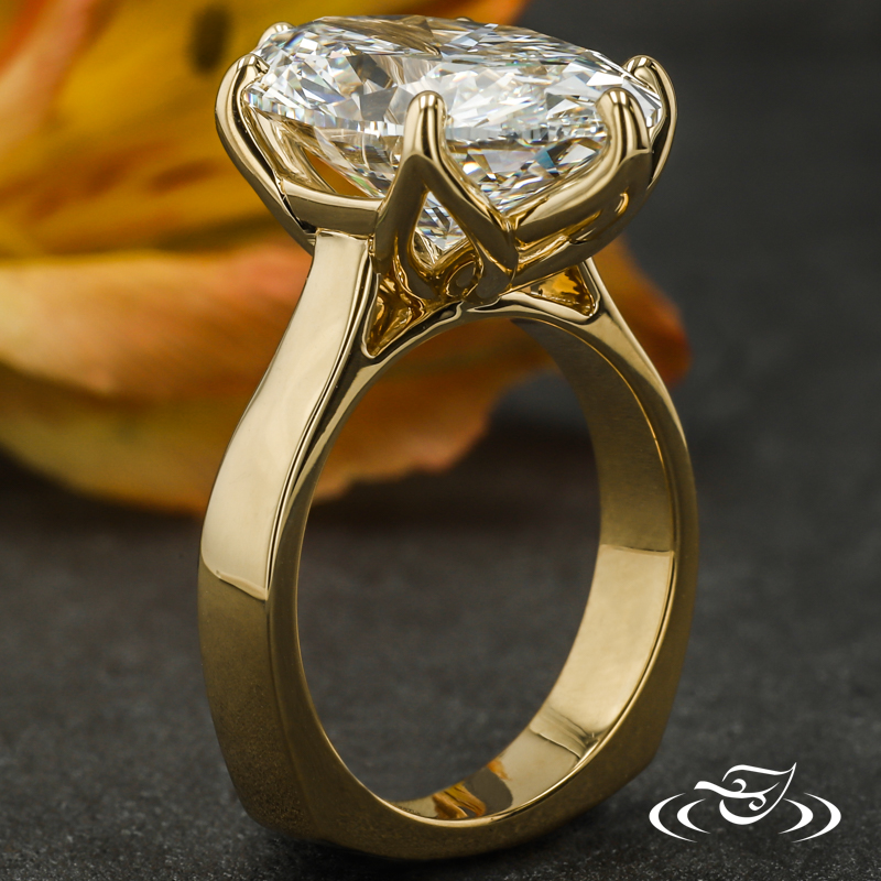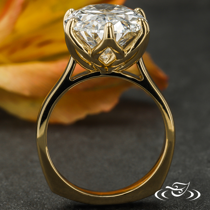 Custom 18kt yellow gold ring featuring (1) 6-prong set GLJW provided oval lab diamond center stone. This ring also has a round-in/square-out, reverse-taper shank with slightly domed profile and a high polish finish.