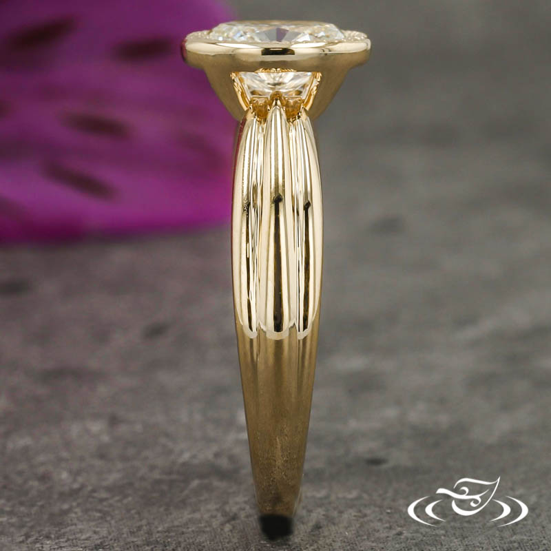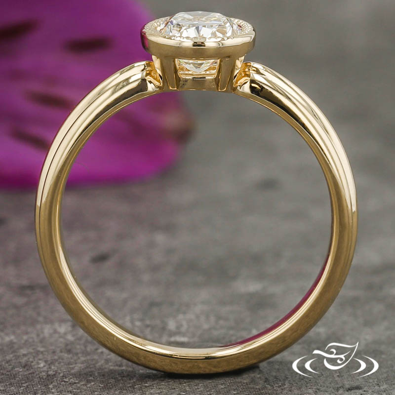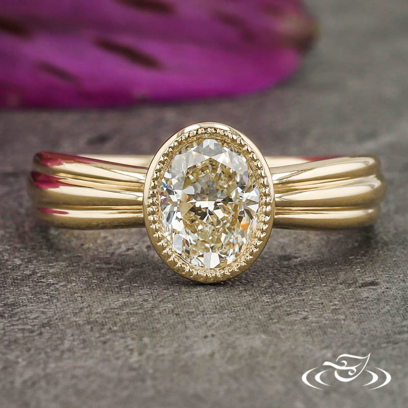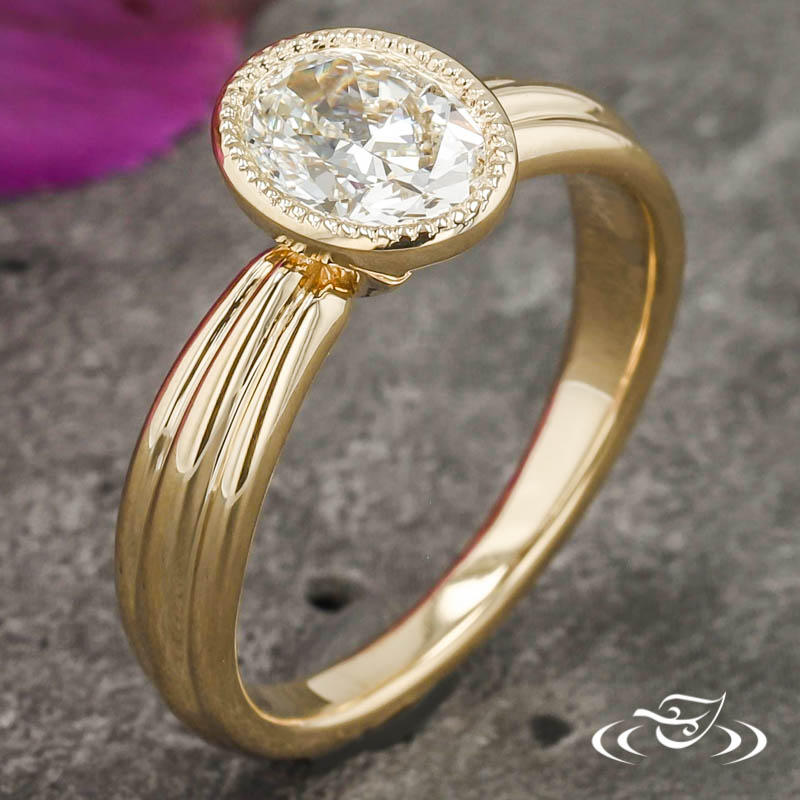 Custom 14kt yellow gold solitaire ring holding (1) bezel set customer provided oval cut diamond center stone. The inner bezel edge is framed in milgrain. The round shank has a curve tapered design with (2) prominent grooves, forming (3) raised rows, along the top ~three-quarters. All with a high polish finish.