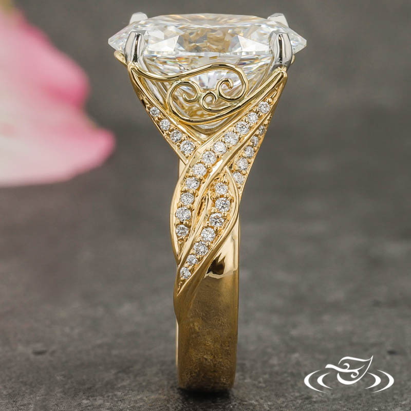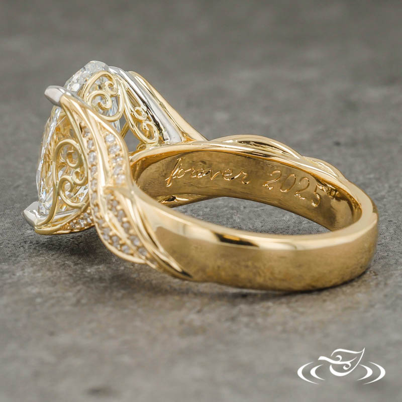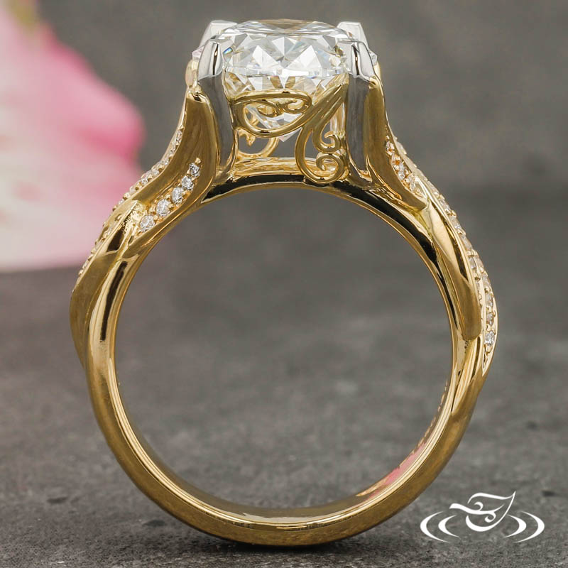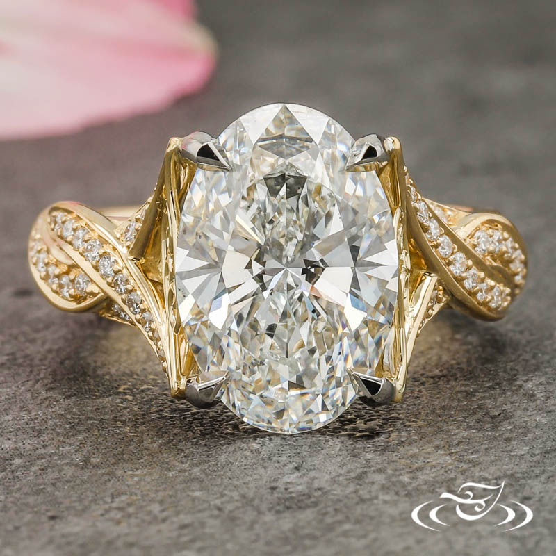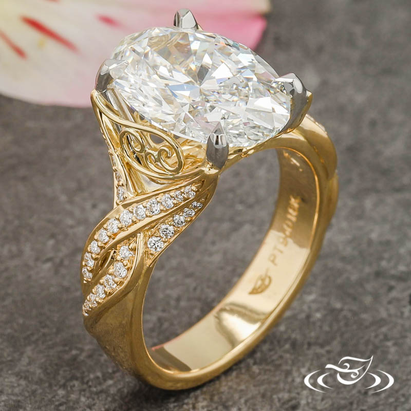 Custom 2 tone platinum and gold ring holding a 4-prong set GLJW provided oval lab diamond center stone. The shank has a twist design with diamonds approx halfway around the ring. Expertly crafted with handmade fine wire filigree on the side faces. This ring also has a high polish finish.