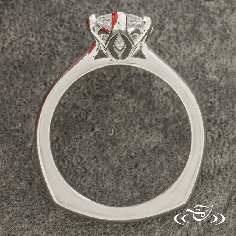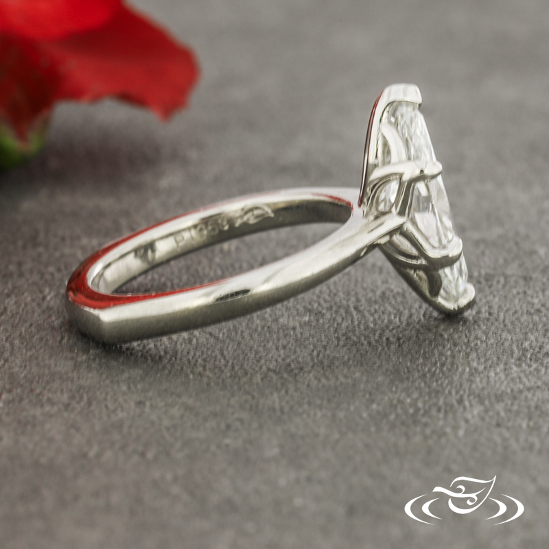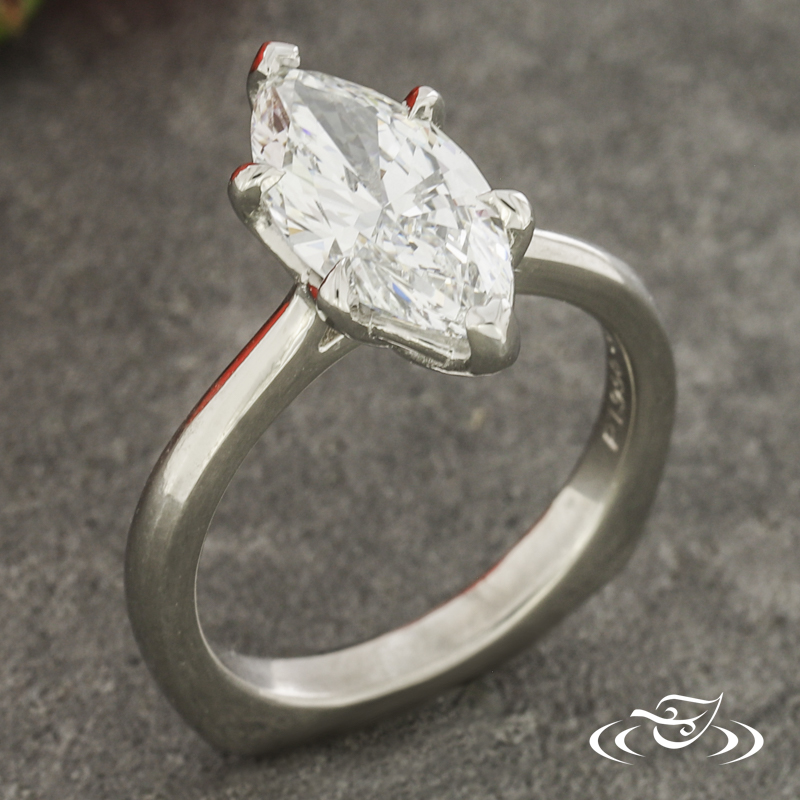 Custom 950 platinum ring holding a 6-prong Chevron set customer provided marquise center stone. This ring also has a round shank and a high polish finish.