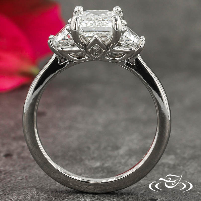 Custom 950 platinum ring holding (1) 4-prong set GLJW provided emerald cut lab diamond center stone flanked by (2) 4-prong set GLJW provided trapezoid cut lab diamond side stones. The side faces of the settings have a pierced lotus motif. The remainder of the ring is comprised of a reversely tapered round domed shank. All with a high polish finish.