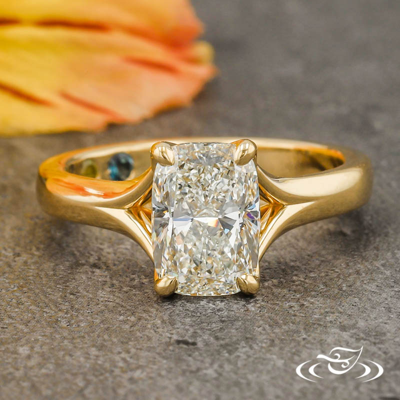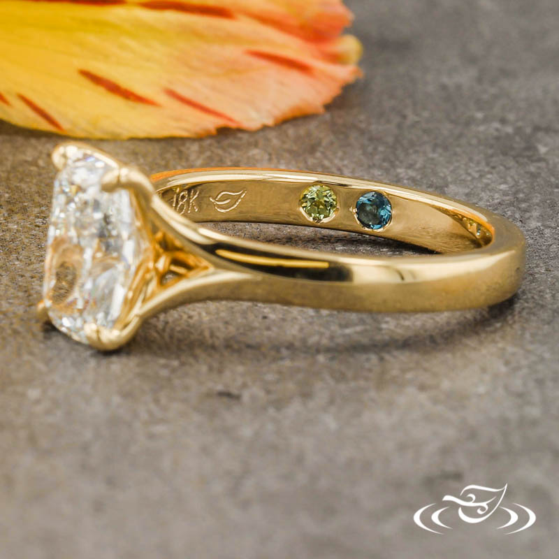 Custom 18kt yellow gold ring holding a 4-prong set GLJW provided cushion lab diamond center stone. This ring also has a round shank with (1) peridot & (1) blue topaz set on the inside. High polish finish.