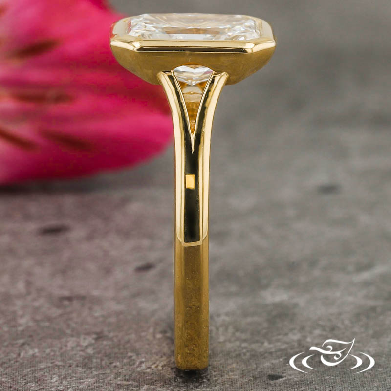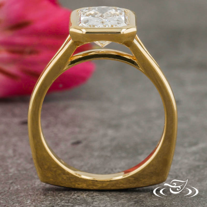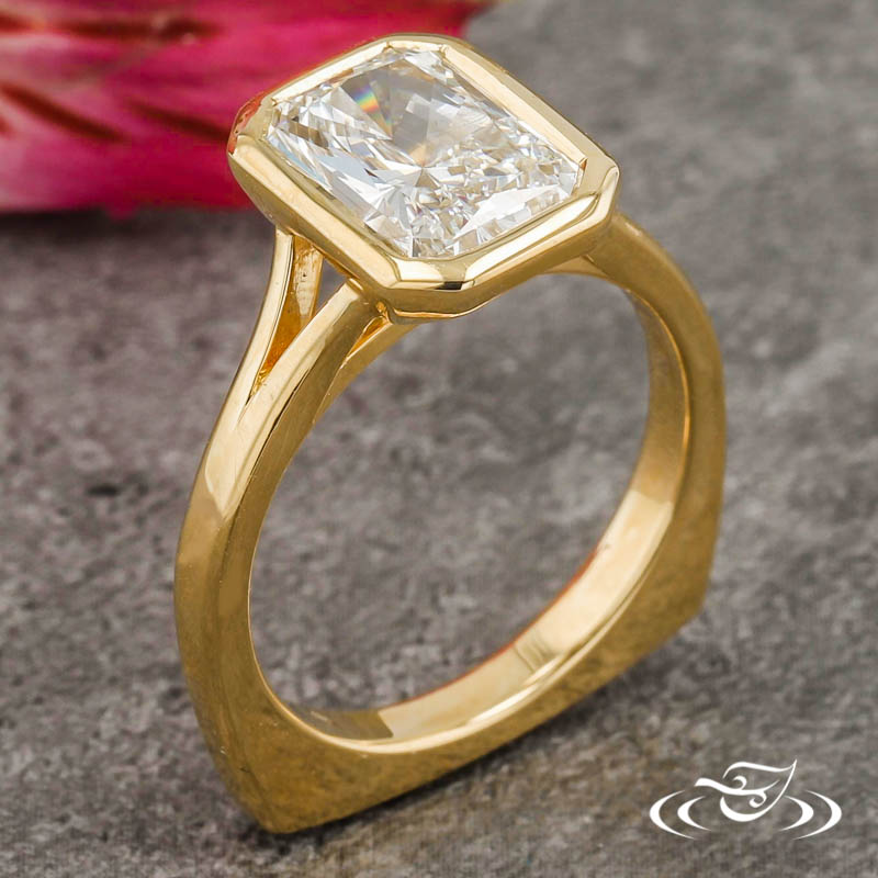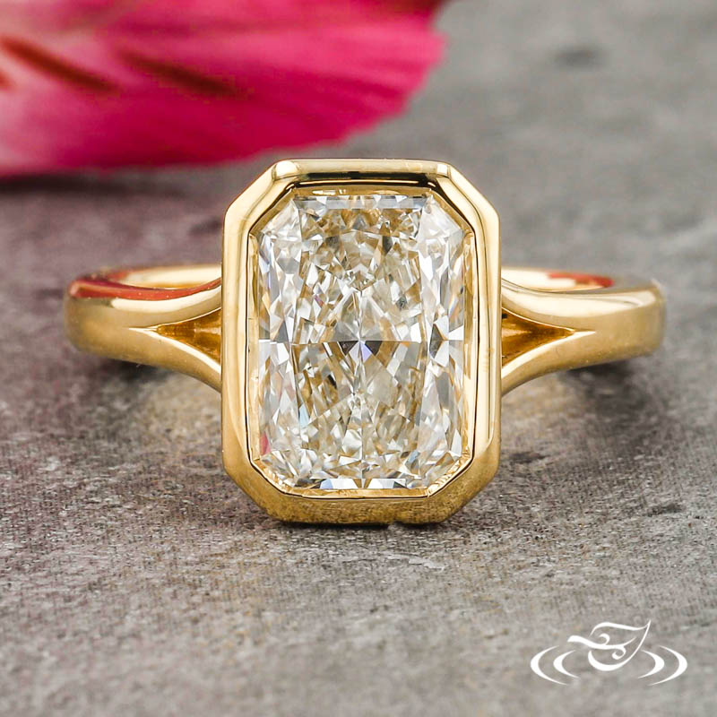 Custom 18kt yellow gold ring holding a bezel set customer provided radiant lab diamond center stone. This ring also has a round in/square out split shank and a high polish finish.