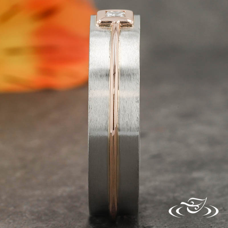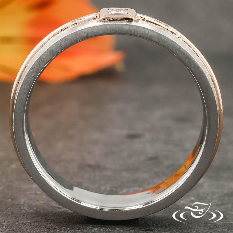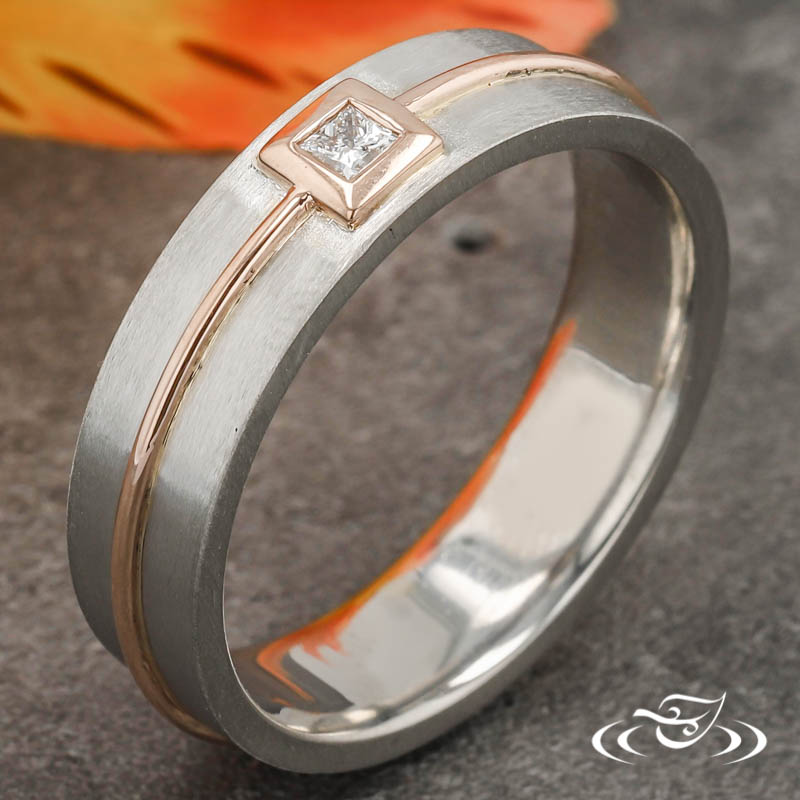Custom two-tone band comprised of a 950 platinum flat comfort fit base. Assembled around the center of the top face is a 1mm wide 14k rose gold strip of raised inlay. At the top of the band is (1) 14k rose gold bezel setting holding (1) GLJW provided princess cut lab diamond center stone. This band has a high polish finish on the rose gold and a brushed matte finish on the platinum.