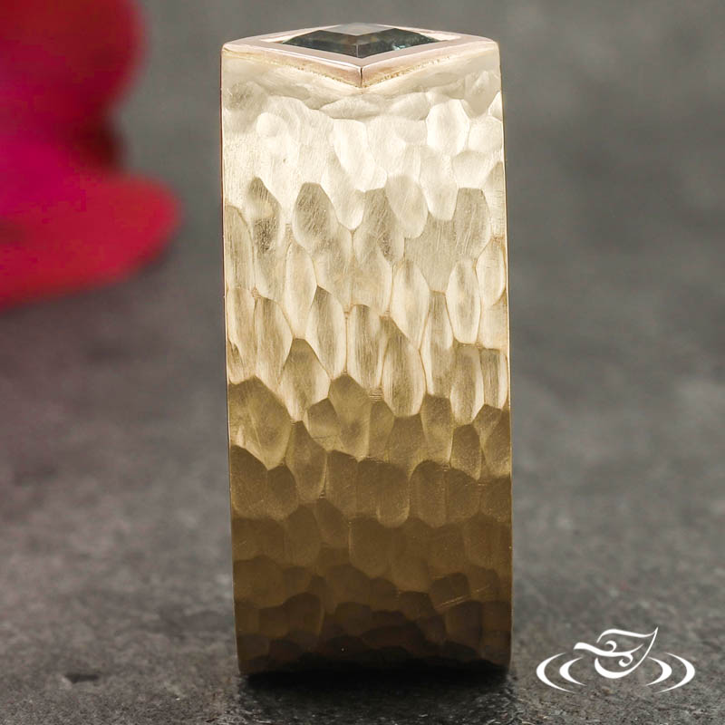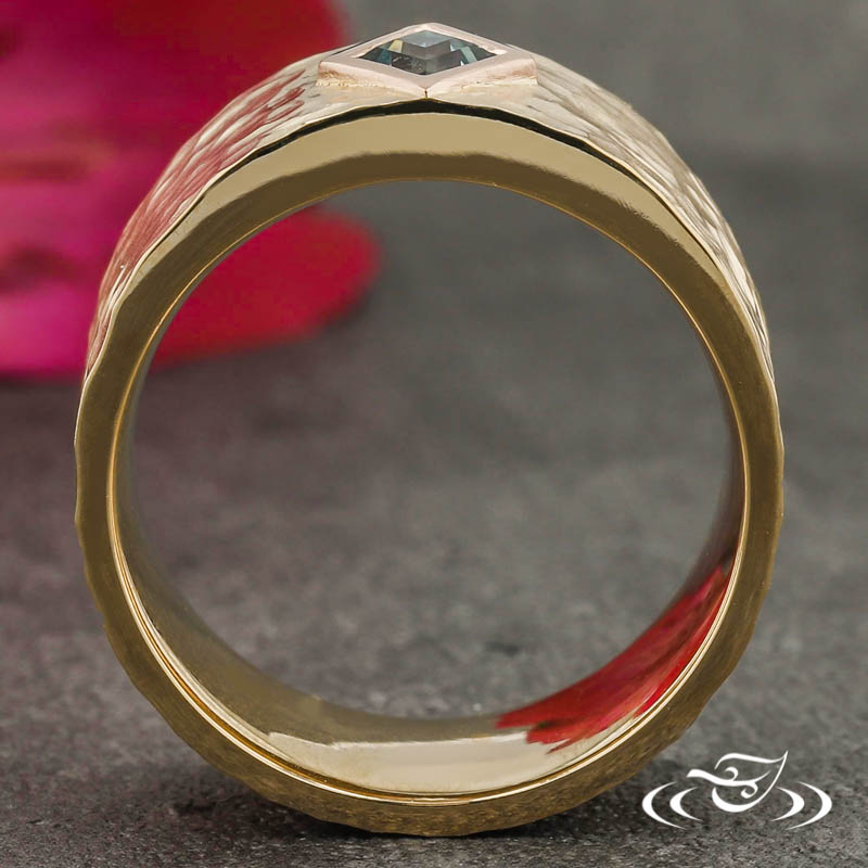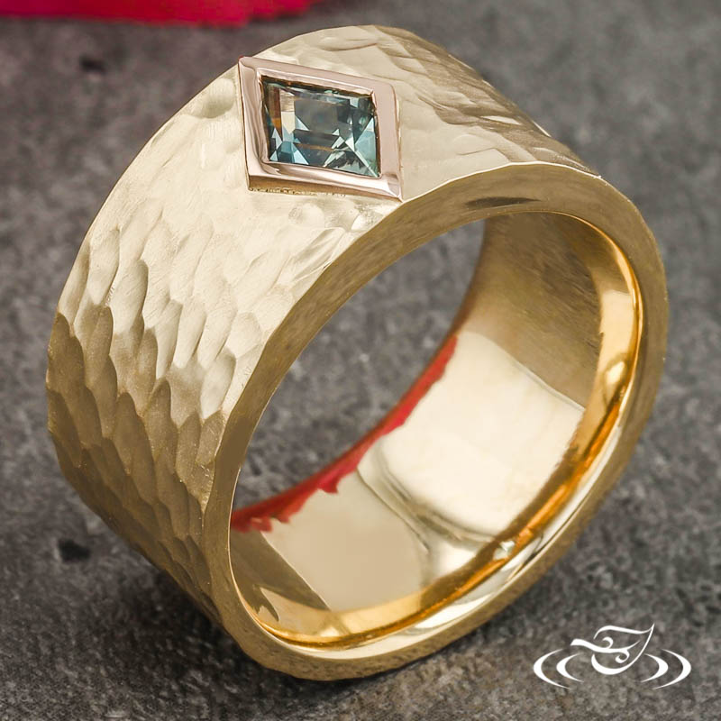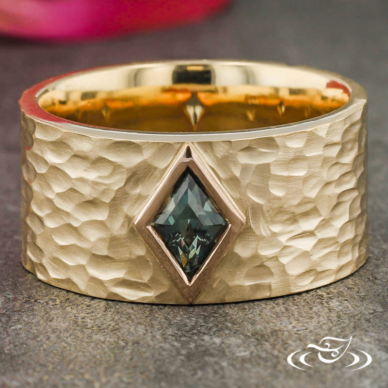 Custom 14k Yellow Gold ring with Hammer Texture holding a GLJW provided kite sapphire center stone set in a 14k Rose Gold Bezel.