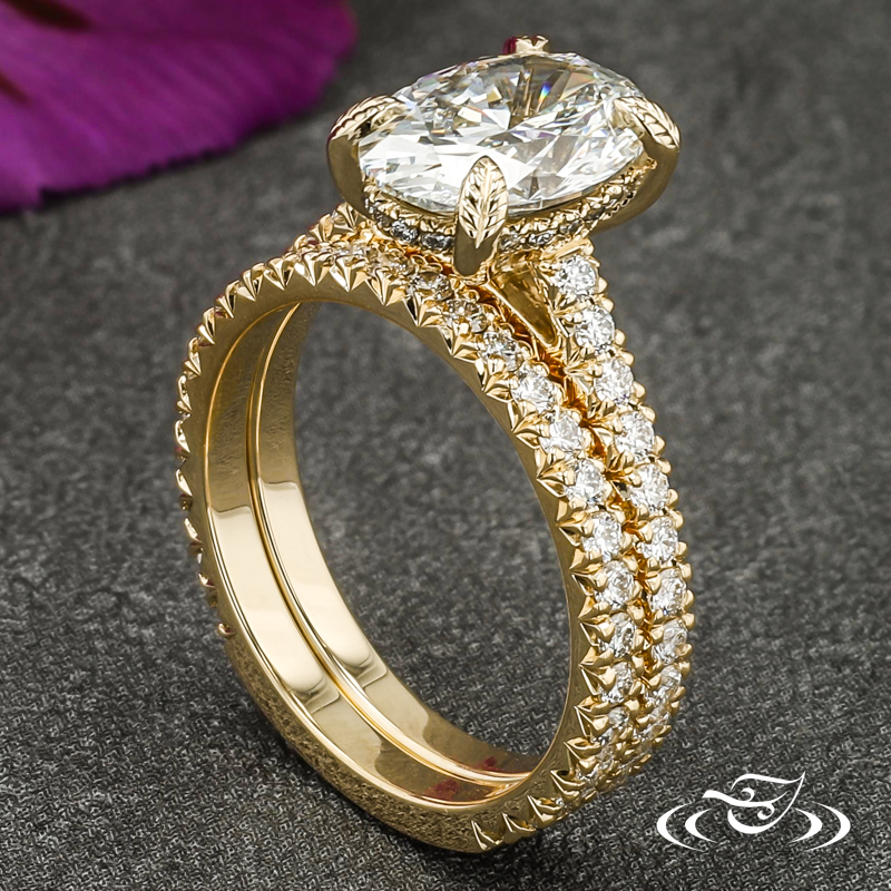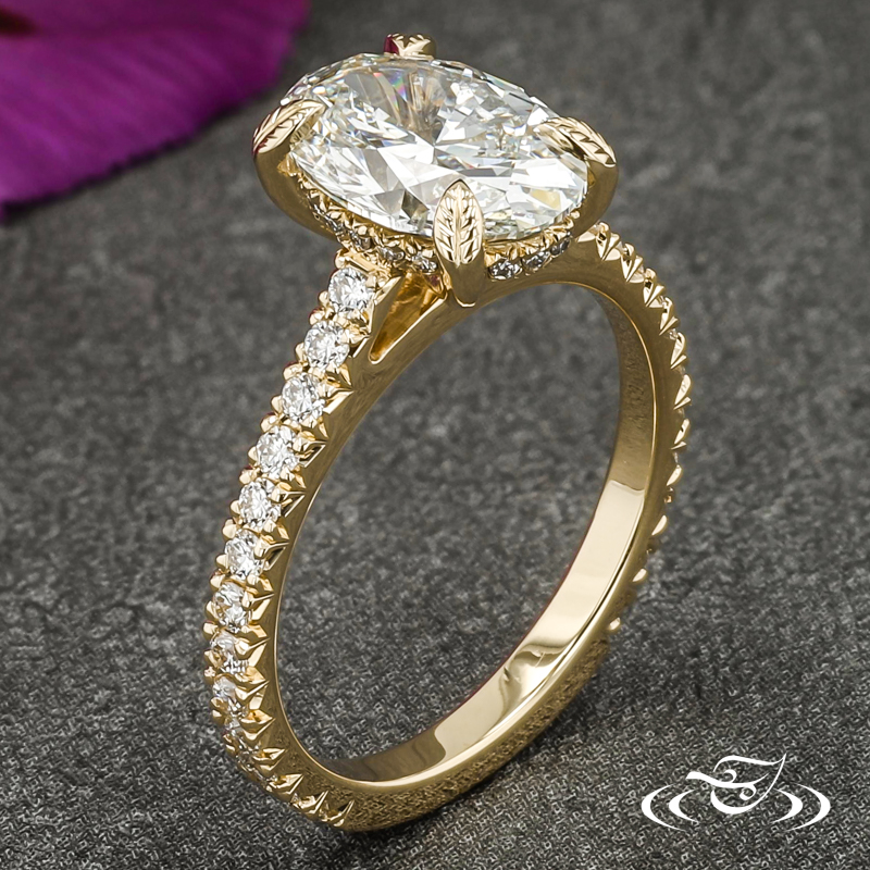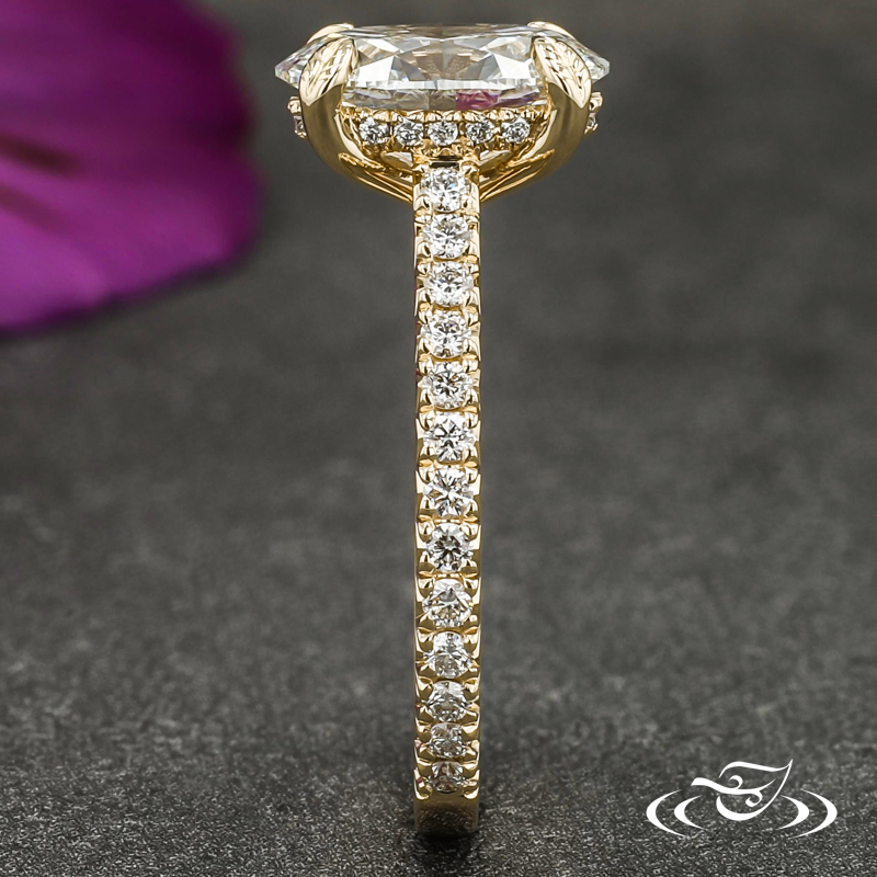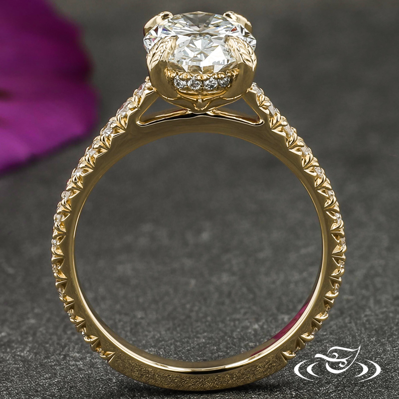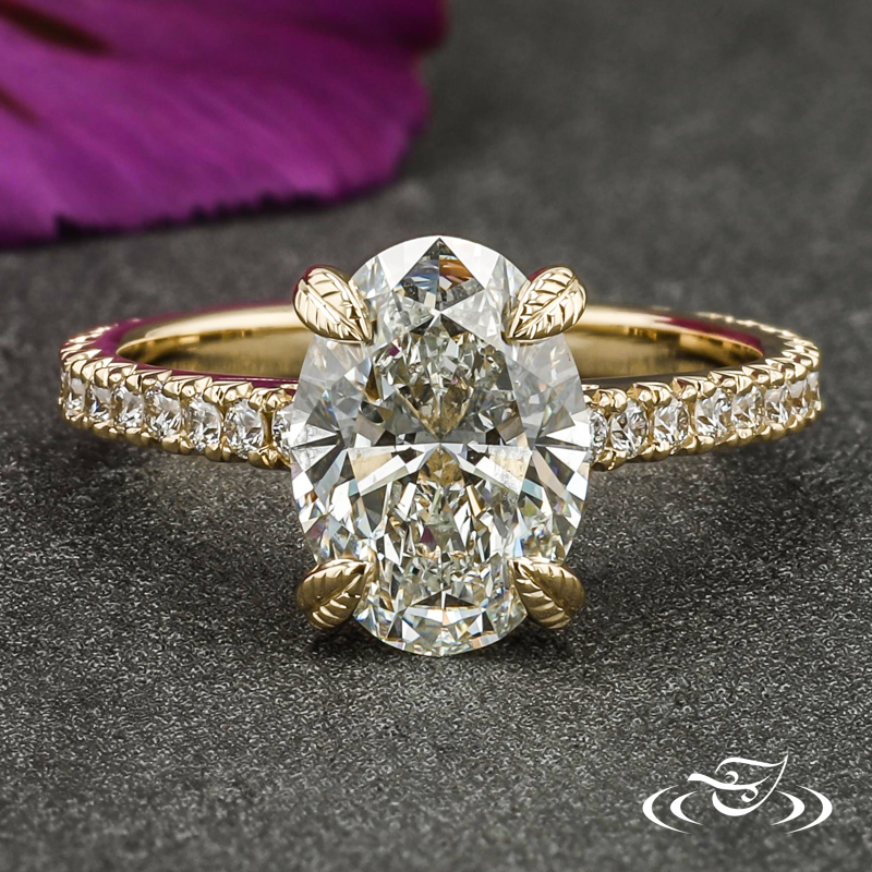 Custom 14kt yellow gold ring featuring (1) GLJW provided oval diamond center stone set with (4) hand engraved leaf prongs with hidden halo of GLJW provided round brilliant diamond melee. GLJW provided round diamond melee are french set on shoulders ending 3/4 down. This ring also has a round shank, slightly domed profile, and a high polish finish.