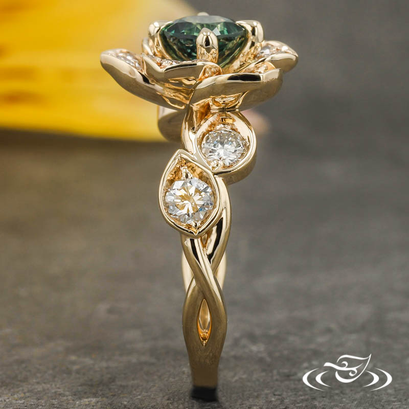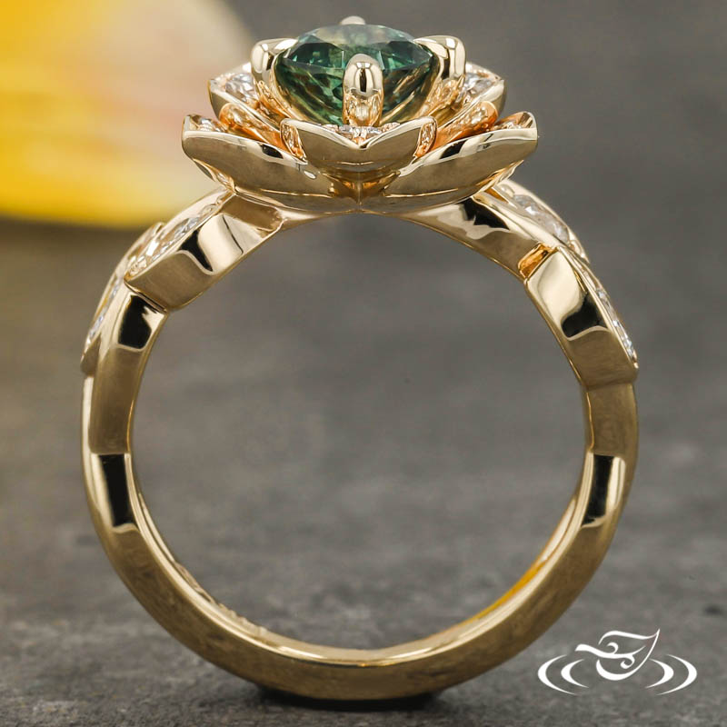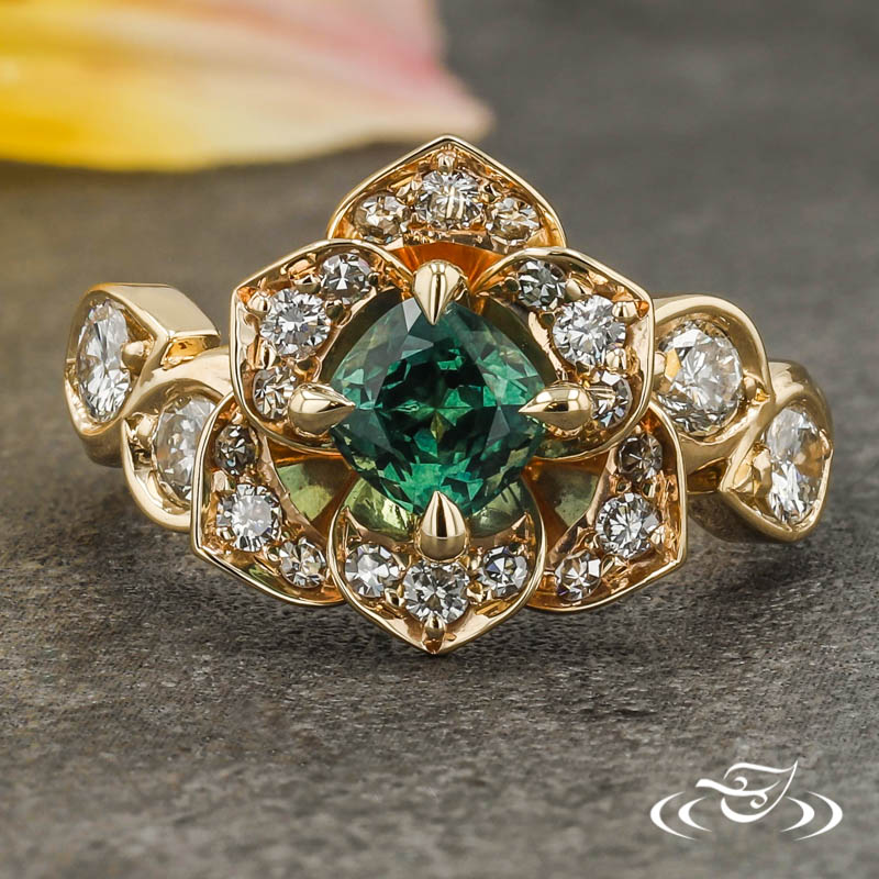 Custom 14kt yellow gold ring featuring (1) GLJW provided cushion teal Montana sapphire center stone 4-prong set with prongs at NESW orientation in 2-tier 6-petal floral setting. Each petal features (2) client provided round single cut diamond melee and (1) client provided round brilliant cut diamond melee bead set. Shoulders feature pierced strands and leaves, each leaf holding (1) client provided round brilliant diamond melee bead set. Remainder of round shank has slightly domed profile, all with high polish finish.