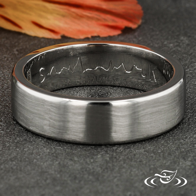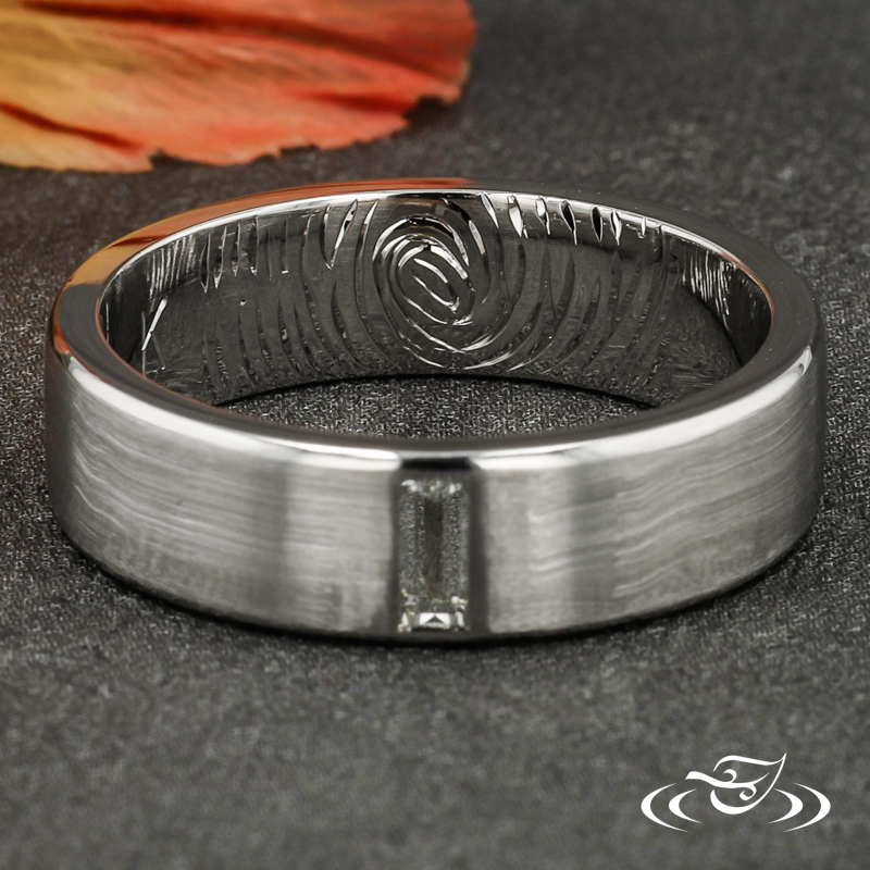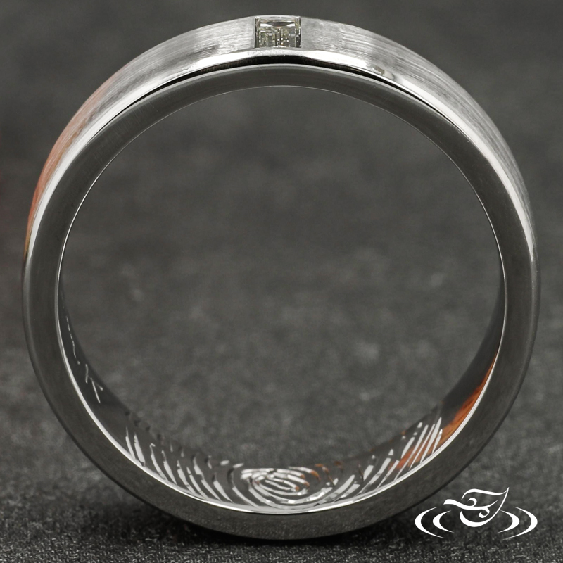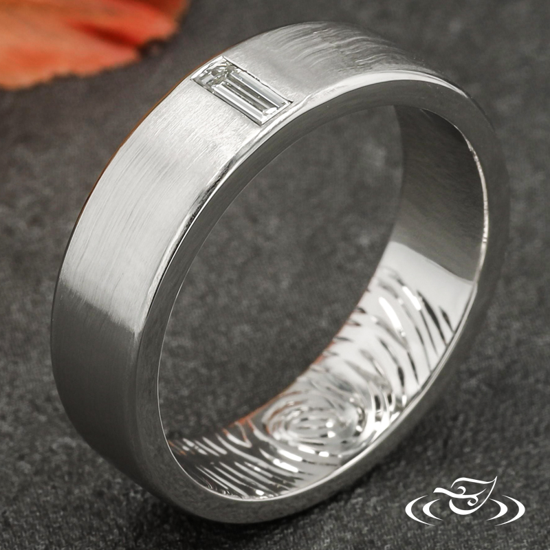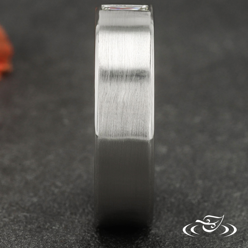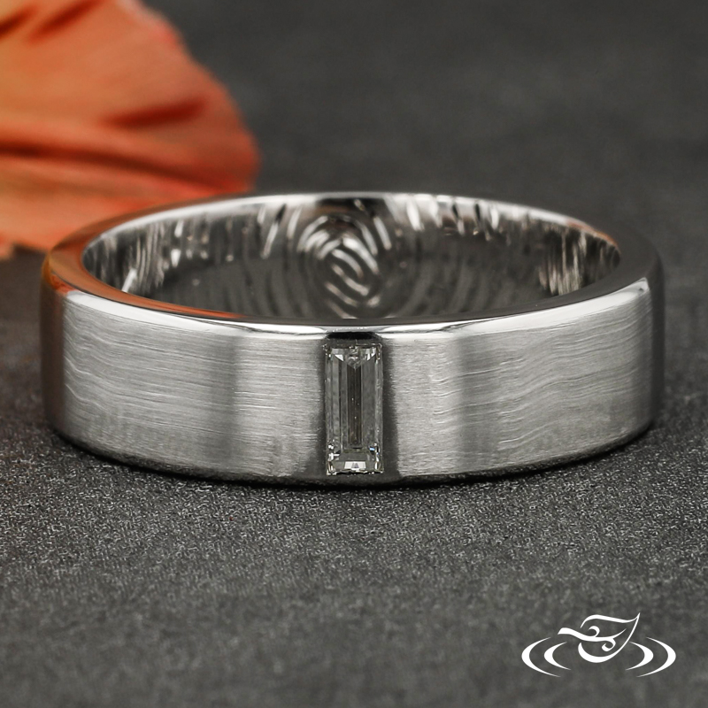 Custom 950 platinum band with round shank, matte center, and high polish beveled edges featuring (1) vertically flush set GLJW provided baguette diamond at top center face.