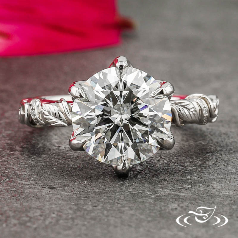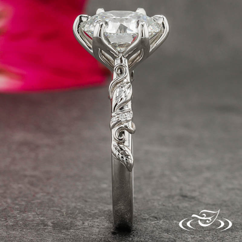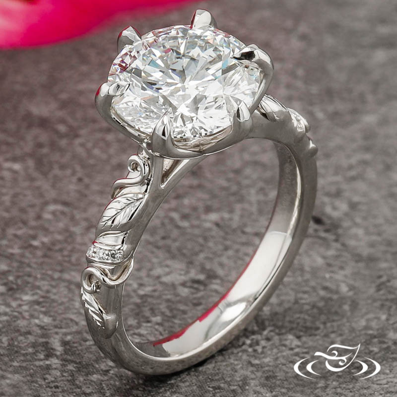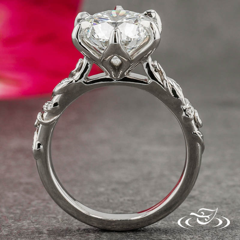 Custom 950 platinum ring holding (1) 6-prong set previously purchased. The top half of the round domed shank is accented in cast-in-place leaves and hand fabricated filigree curls and vines. A total of (6) GLJW provided round cut lab diamond melee are also bead set in (2) diagonal raised ribbons within the other details. Each leaf is accented by hand engraved vein detailing. All with a high polish finish.
