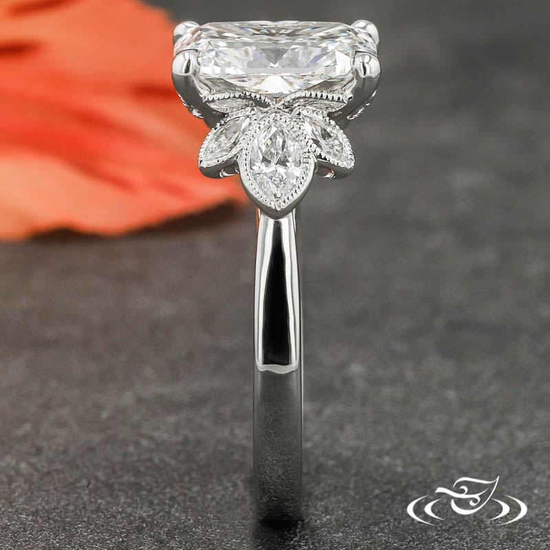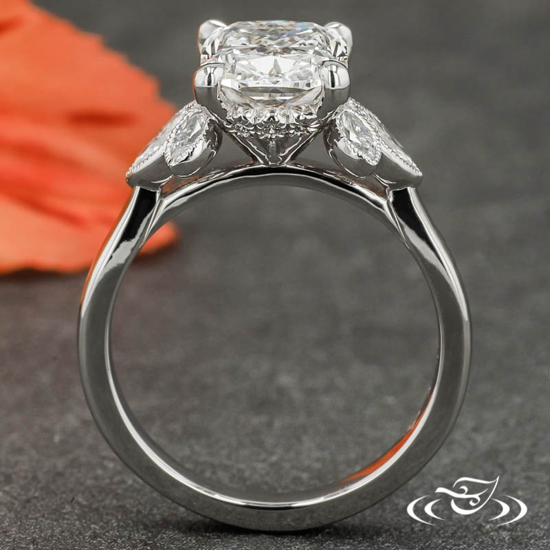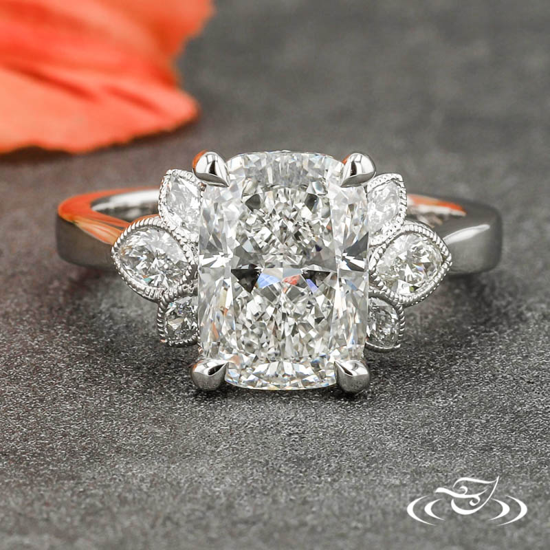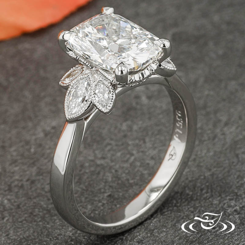 Custom 950 platinum cluster style ring holding a 4-prong set GLJW provided cushion lab diamond center stone flanked by (3) bezel set GLJW provided marquise diamonds on either shoulder, and with (6) GLJW provided bezel set round diamonds in a hidden halo. All accent stones are highlighted with hand crafted milgrain edges. This ring also has a round reverse taper shank and a high polish finish.