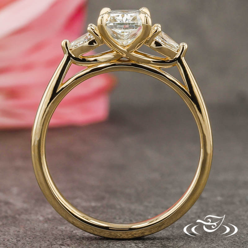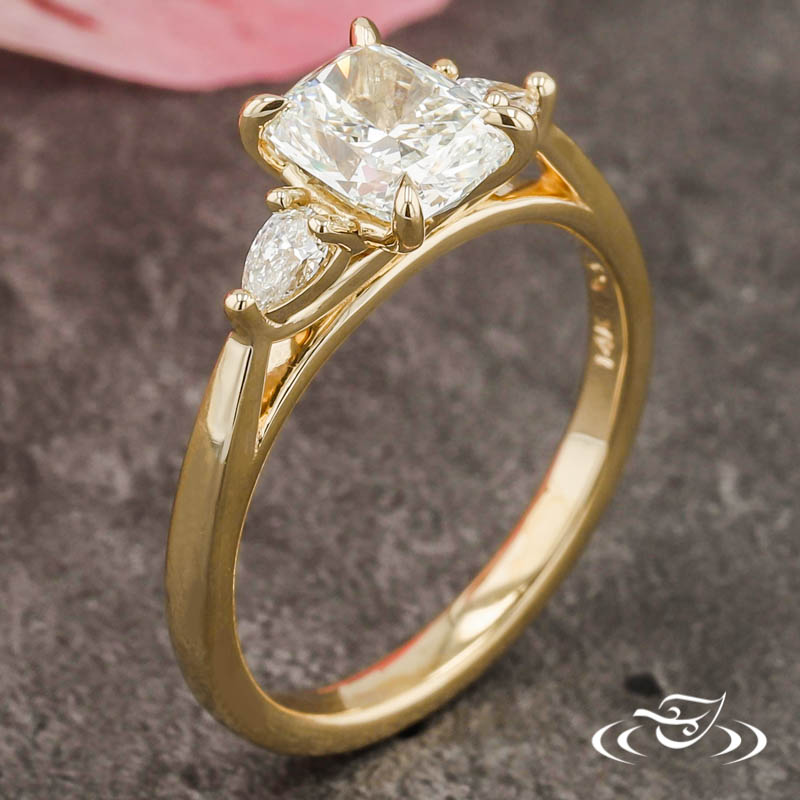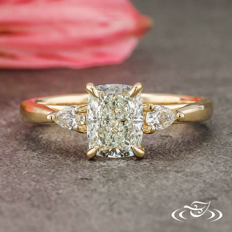Custom 14kt yellow gold ring with a swooping trellis design holding (1) GLJW provided cushion cut diamond center stone 4-prong set with delicate pointed prongs and (2) 3-prong set GLJW provided pear cut diamond side stones. This ring has a reversely tapered round domed shank and a high polish finish.