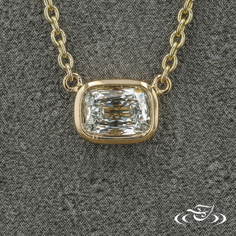 Custom 14kt yellow gold necklace with a stationary pendant holding (1) customer provided cushion cut diamond center stone bezel set lengthwise from east to west. The pendant is attached to a cable chain via (2) small jump rings. All with a high polish finish.