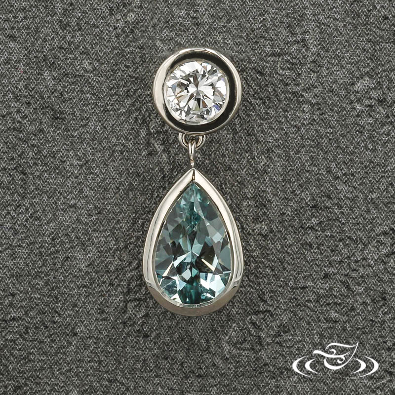 Custom 14kt white gold pendant holding a bezel set GLJW provided pear aquamarine center stone. (1) customer provided round diamond stones bezel set on top face.