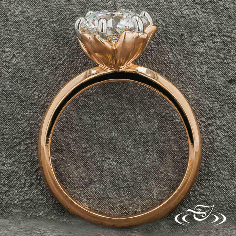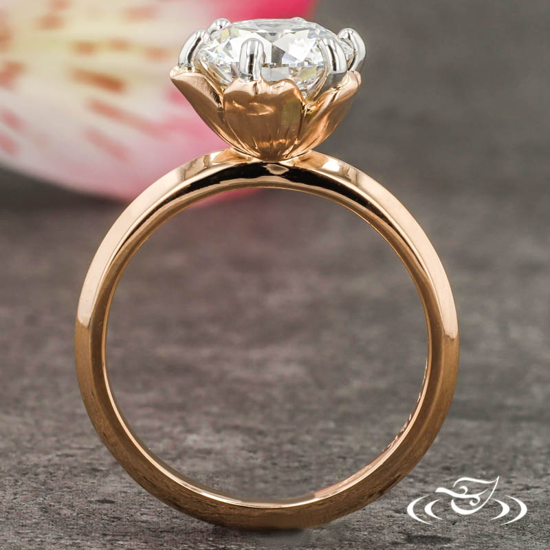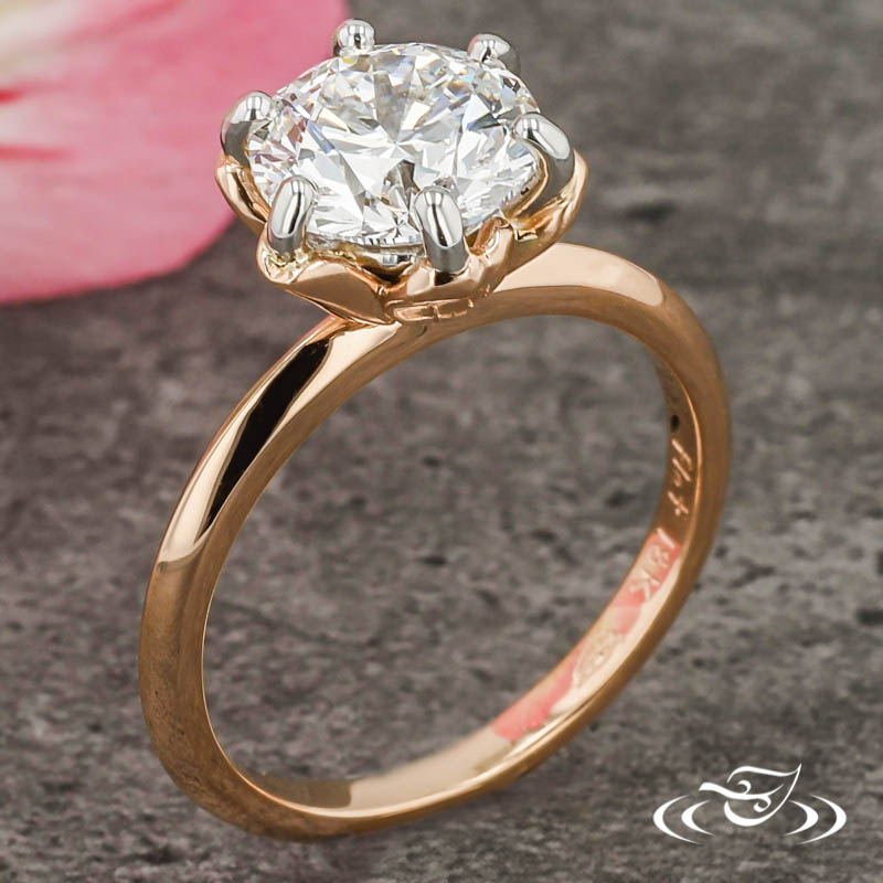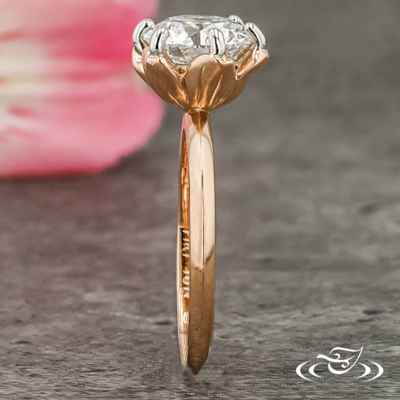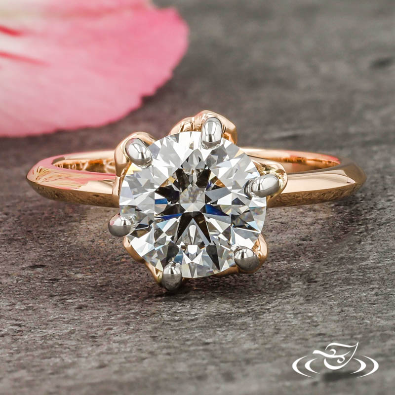 Custom 2-tone ring with 14k rose gold round shank, knife-edge profile, and high polish finish. (1) Client provided round lab diamond is set in (6) platinum prongs in 14k rose gold matte finish cherry blossom center setting with hand engraved petal detailing.