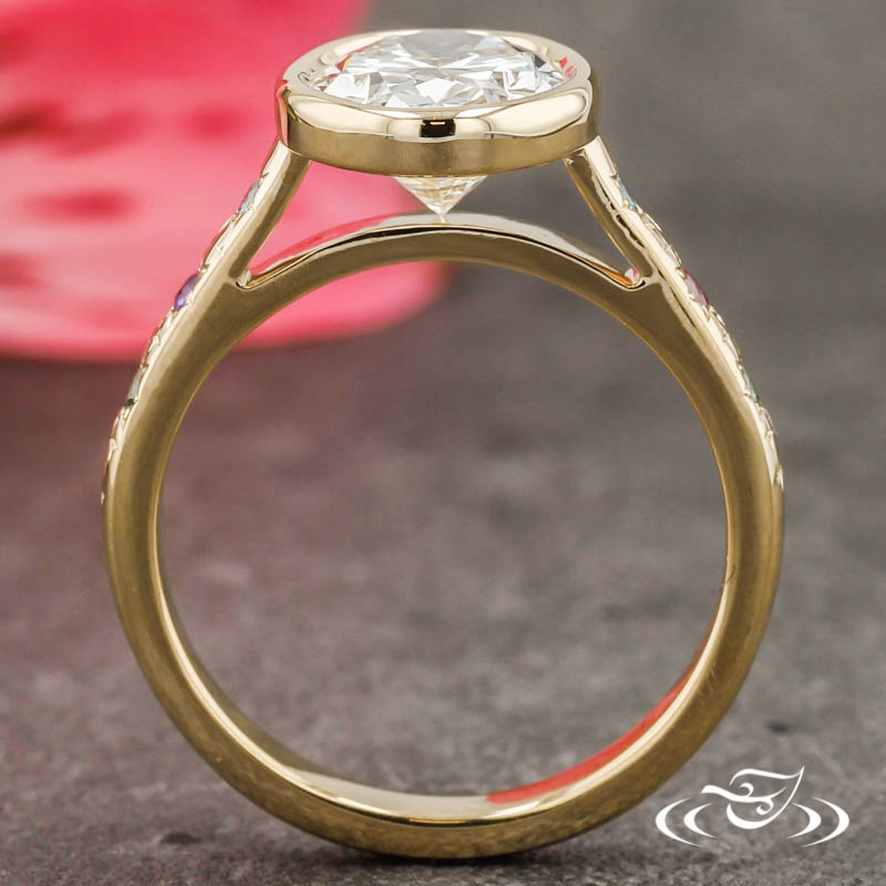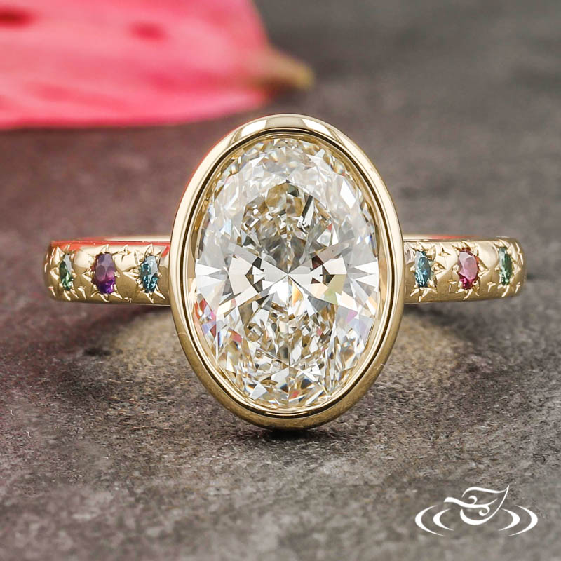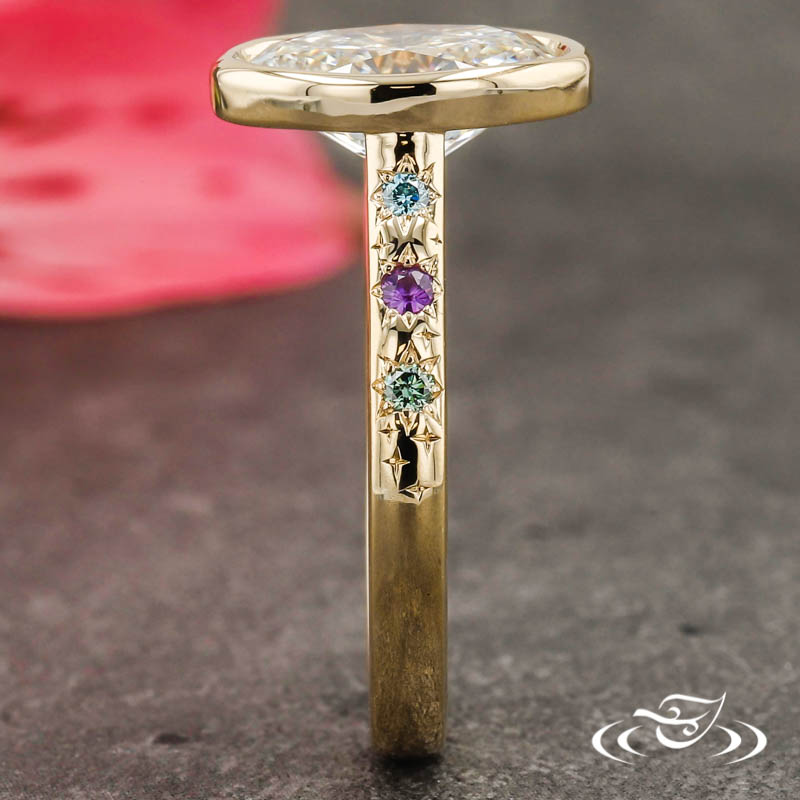 Custom 14kt yellow gold ring with floating bezel holding a GLJW provided oval lab diamond center stone. (3) Blue, Green, & Purple Melee Star Set on either side of Center stone.