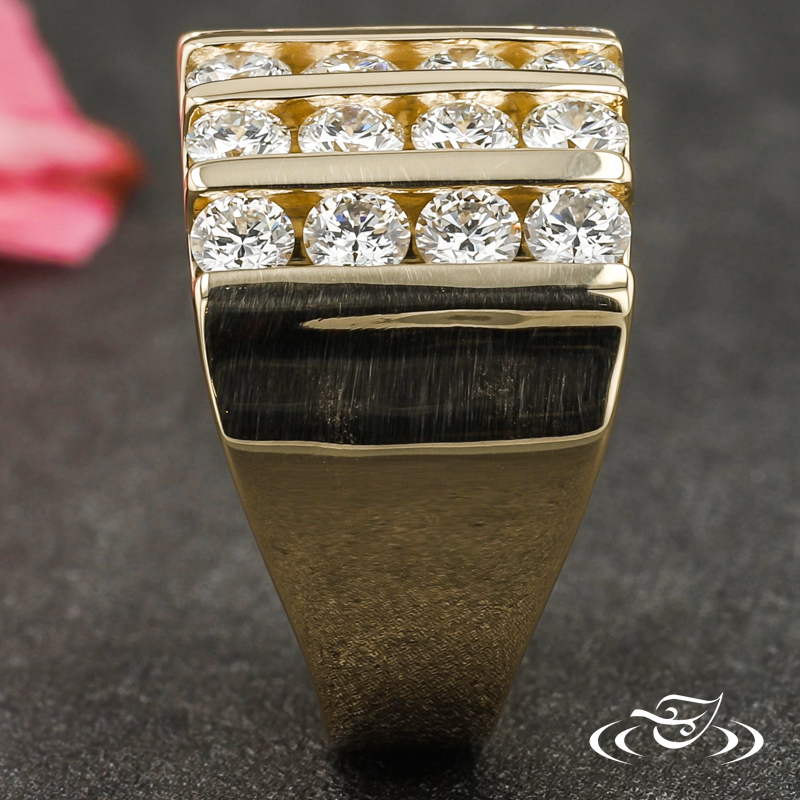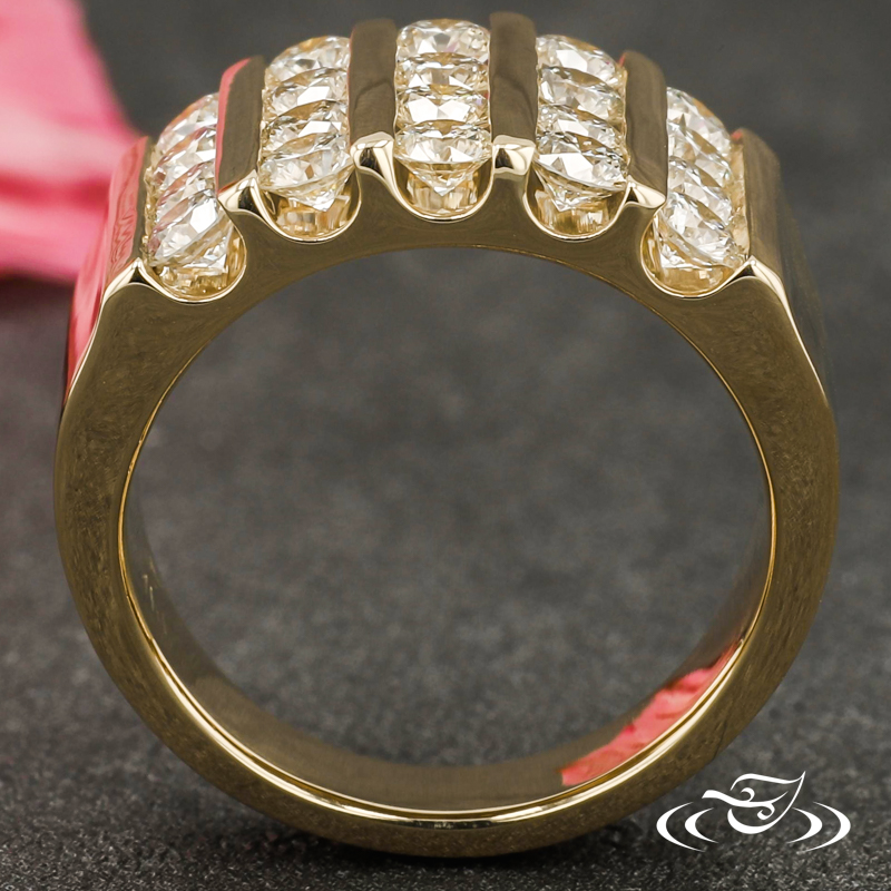 Custom 14kt yellow gold band with round shank, slightly domed profile, and high polish finish featuring (5) rows of (5) customer provided round diamond melee channel set on top face.