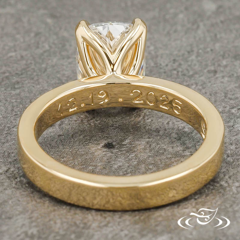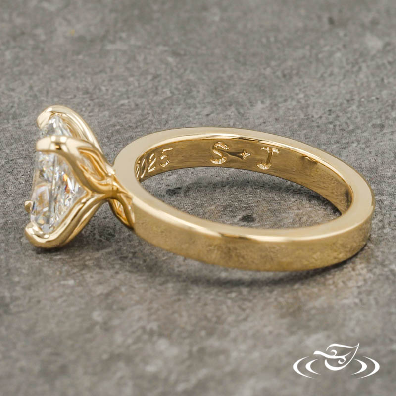 Custom 14kt yellow gold ring holding a 4-prong set GLJW provided cushion lab diamond center stone. This ring also has a round shank and a high polish finish. Inside Engraving Reads: ' 12.19.2025 S+J ' BLOCK FONT