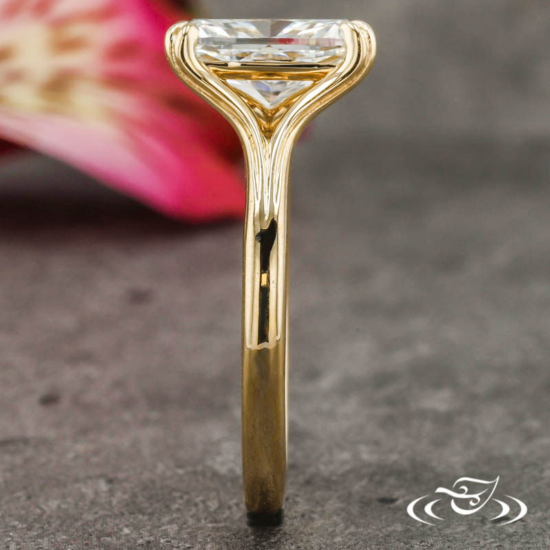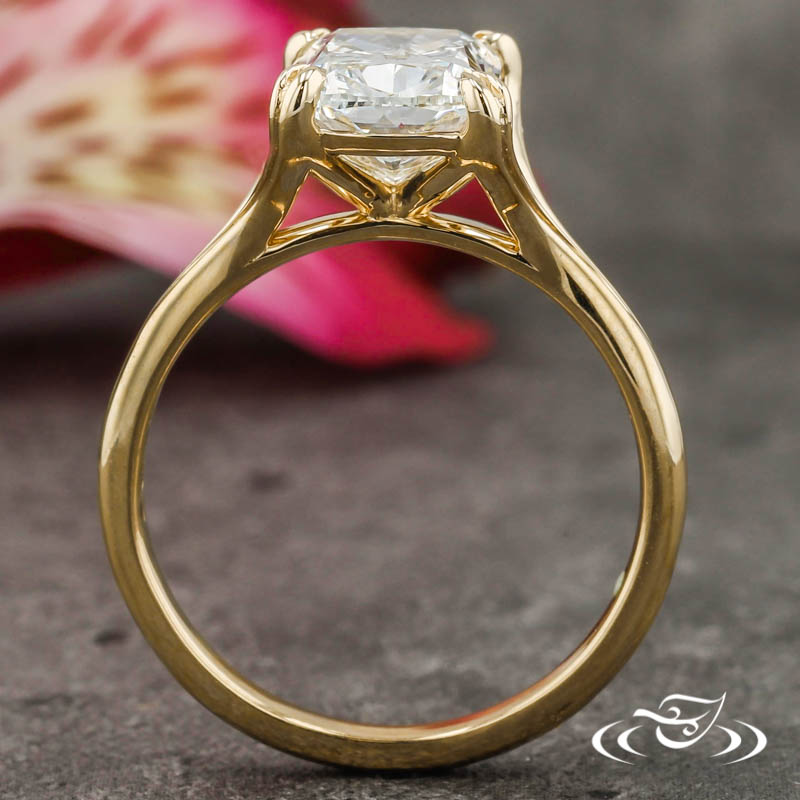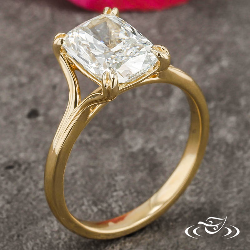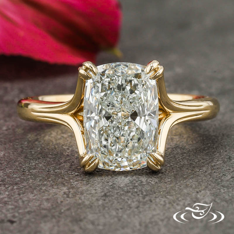 Custom 14kt yellow gold ring holding a 4-prong set GLJW provided cushion lab diamond center stone. This ring also has a split shank and a high polish finish.