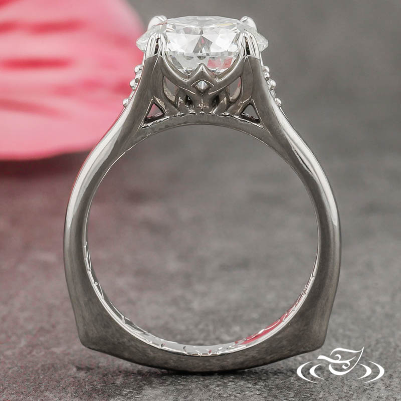 Custom 950 platinum ring holding (1) GLJW provided round cut lab diamond center stone 4-prong set with pointed prongs within a pierced petal-inspired center setting. The split shoulders each hold (3) round cut lab diamond melee prong set in a triangular orientation at the base of the splits. The remainder of the ring has a round inner and square outer shape, domed profile, and a high polish finish.