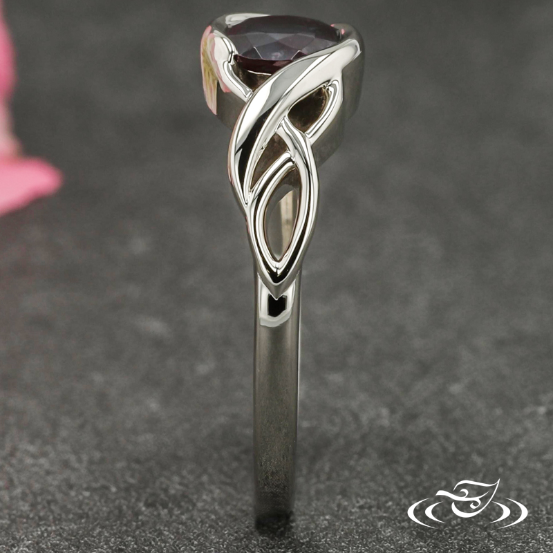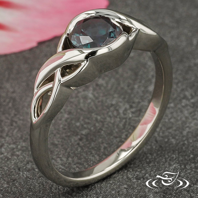 Custom 14kt white gold ring featuring (1) wrap set GLJW provided round lab alexandrite center stone. Pierced twists featured on shoulders. This ring also has a round shank, slightly domed profile, and a high polish finish.