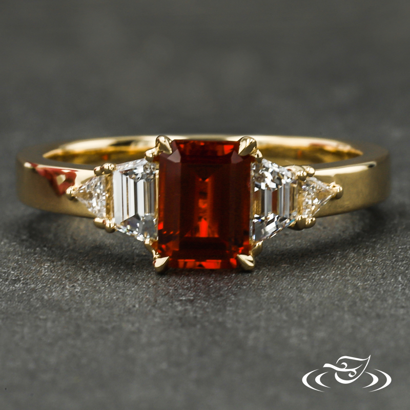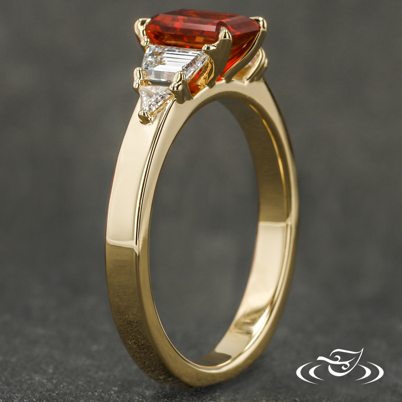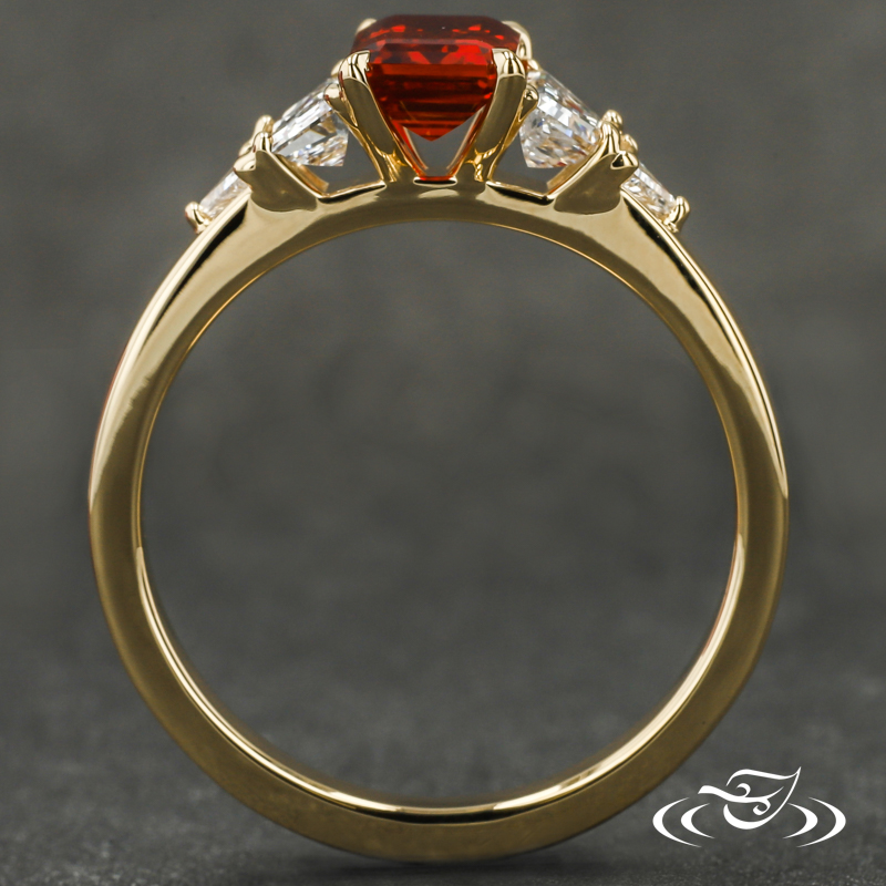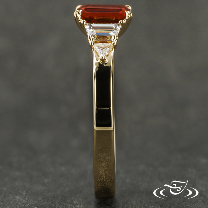 Custom 18kt yellow gold ring featuring (1) 4-prong set GLJW provided emerald cut lab ruby center stone. Round shank has flat profile with (1) GLJW provided trapezoid lab diamond followed by (1) triangle GLJW provided lab diamond prong set on each shoulder. All with high polish finish.