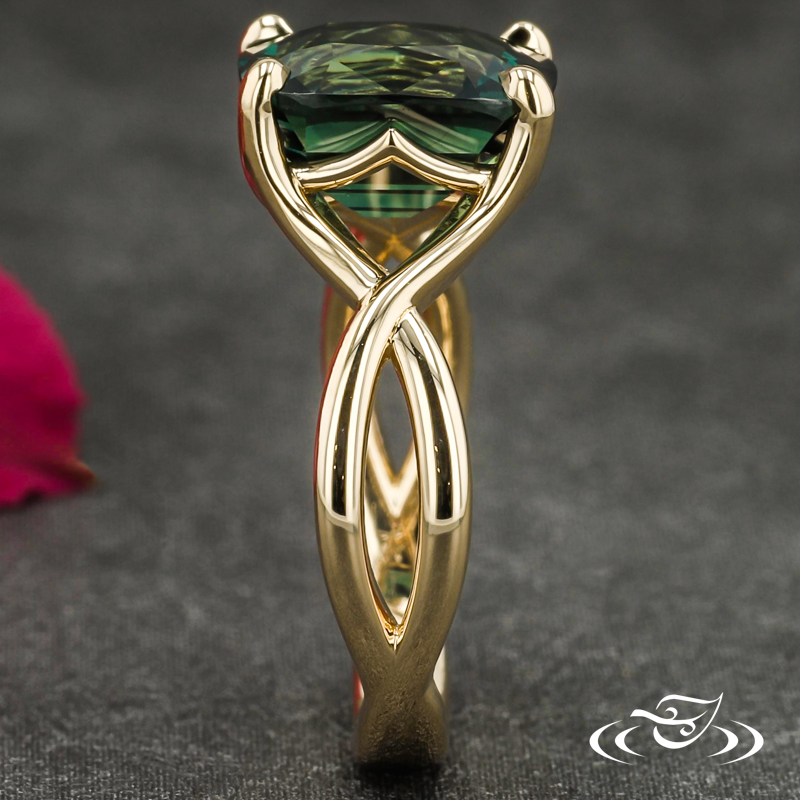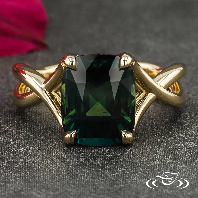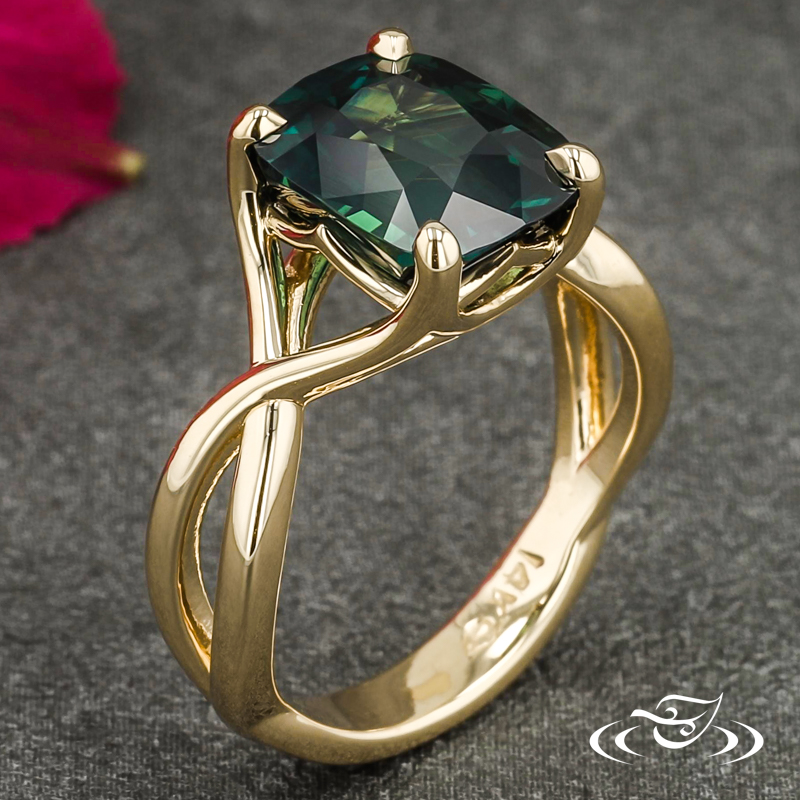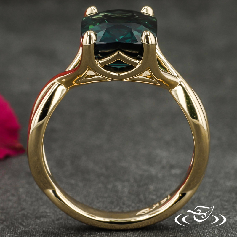 Custom 14kt yellow gold ring featuring (1) 4-prong set GLJW provided cushion teal sapphire center stone in pierced, decorative head. Each shoulder features pierced twists forming singular shank at bottom. All with high polish finish.