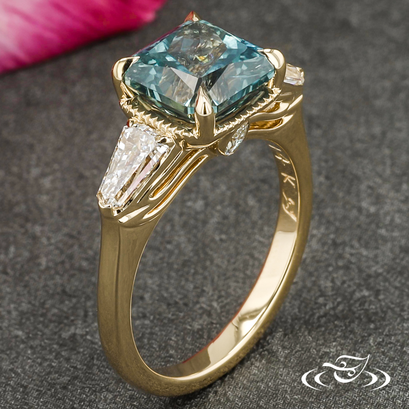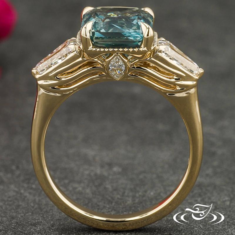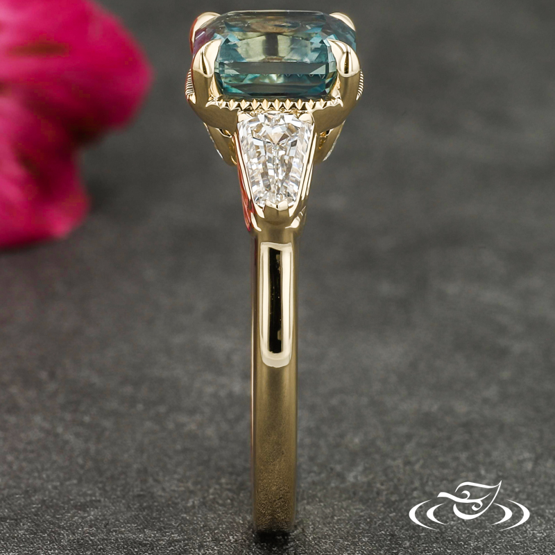 Custom 14kt yellow gold ring holding a 4-prong set GLJW provided radiant sapphire center stone with fine milgrain detailing around setting flanked by (2) GLJW provided shield lab diamond stones 3-prong set on top face. Each side face features pierced wave motifs with (1) GLJW provided marquise diamond melee bezel set. This ring also has a round, reverse taper shank, slightly domed profile, and a high polish finish.