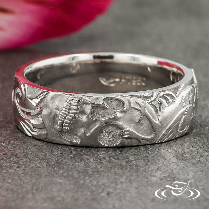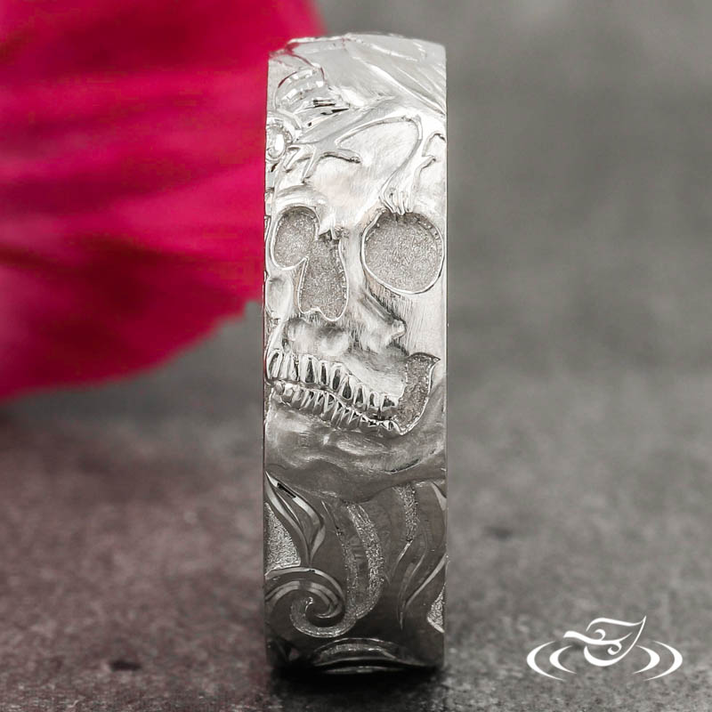Custom 950 platinum band with a round shape and flat comfort fit profile. Cast in place around the top face in an intricate motif including a skull, crow, and smoke. Within those details are (3) layers of detailing with a combination of matte, stippled, and high polished elements. Additional detailing is hand engraved throughout the design. This band has a hand engraved coffee mug with an X in the center and (1) GLJW provided heart cut lab alexandrite flush set on opposite sides of the inside.