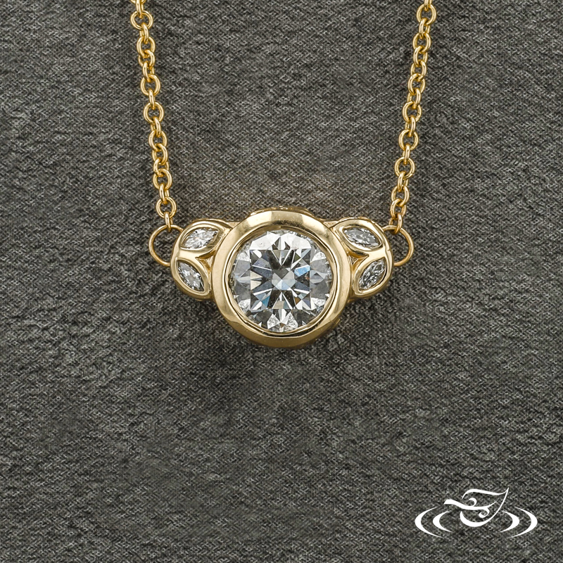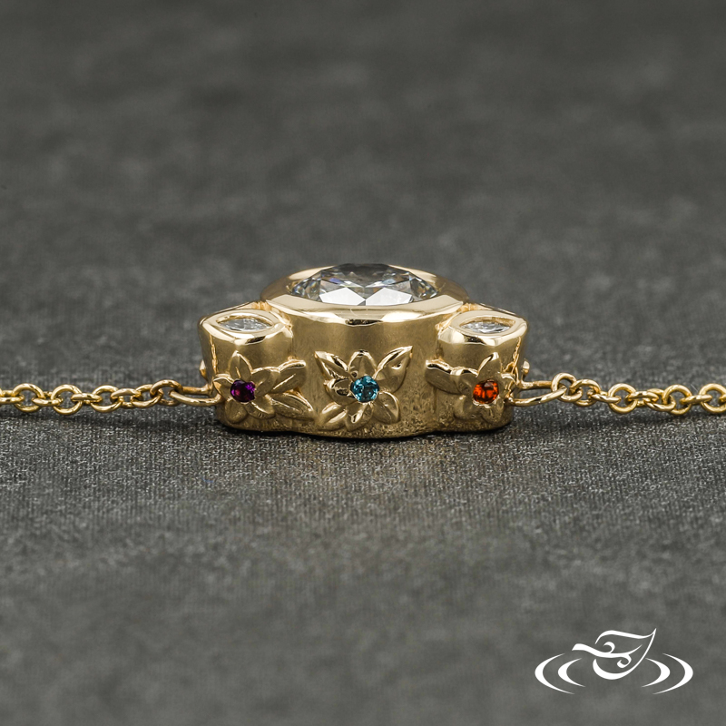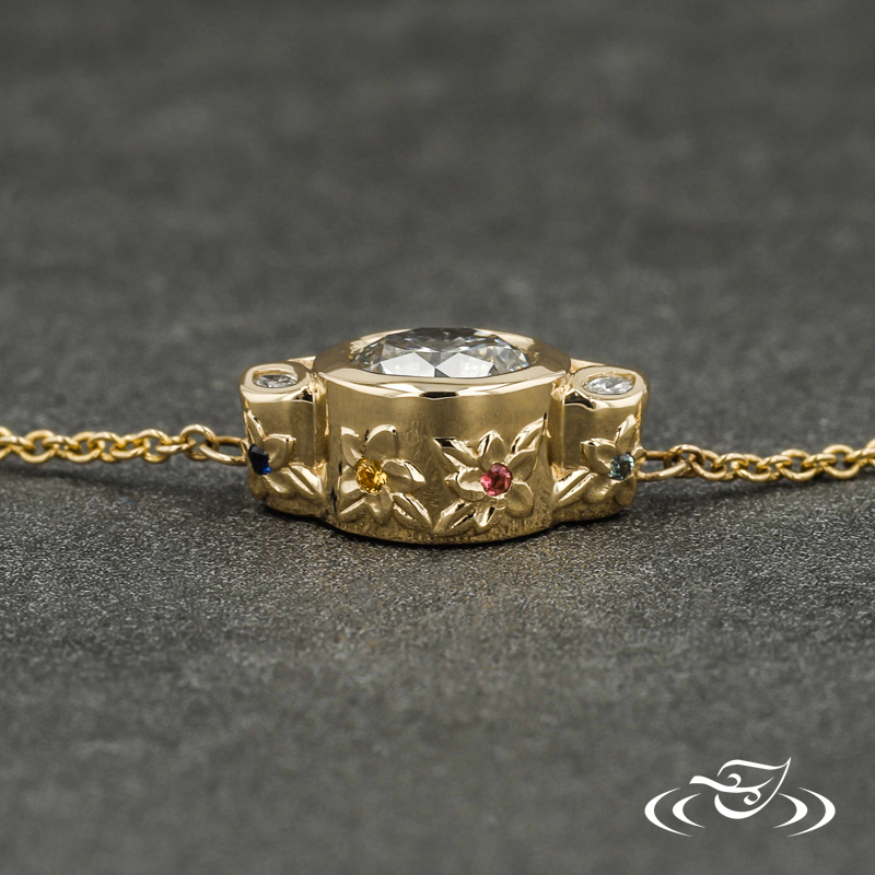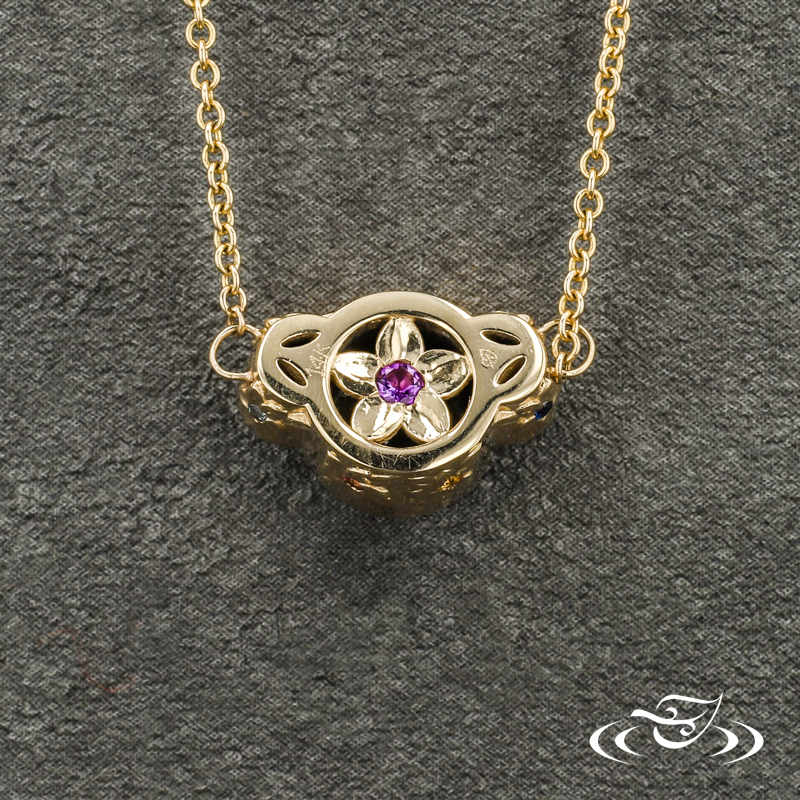 Custom 14k yellow gold necklace in high polish finish featuring (1) pendant at center attached to GLJW provided 1.3mm 18" cable chain. Pendant features (1) client provided round brilliant diamond flanked by (4) GLJW provided lab marquise diamond melee, all bezel set. Walls of bezel and back of pendant has sampaguita flowers with (1) GLJW provided round melee flush set at center of each flower: (2) amethyst, (1) citrine, (1) London blue topaz, (1) garnet, (1) pink tourmaline, (1) lab alexandrite, and (1) blue sapphire.