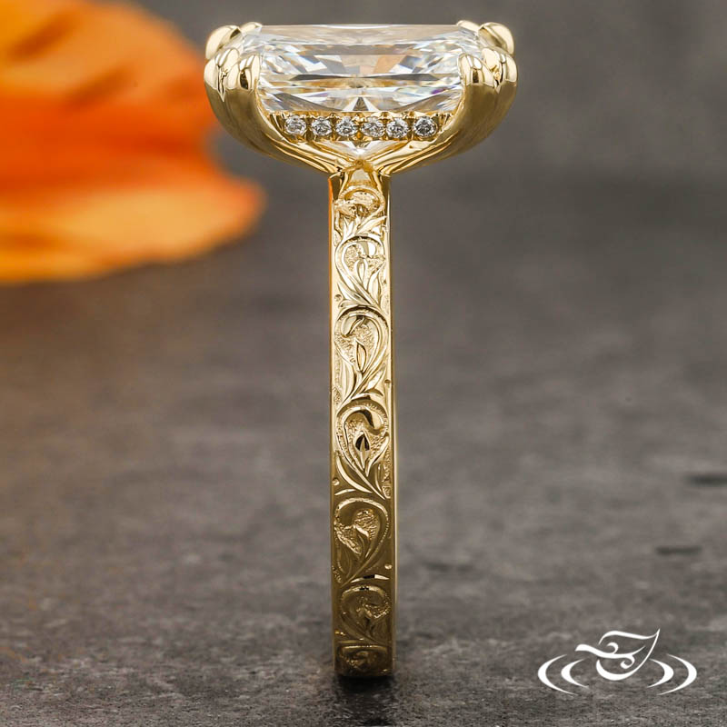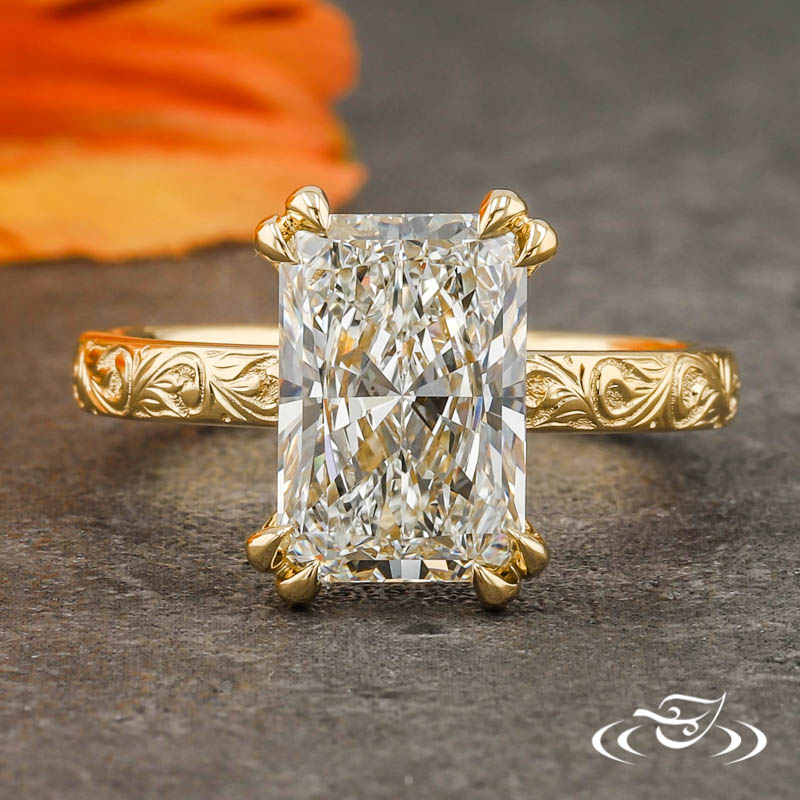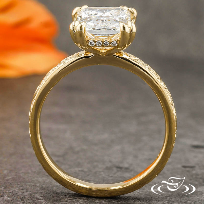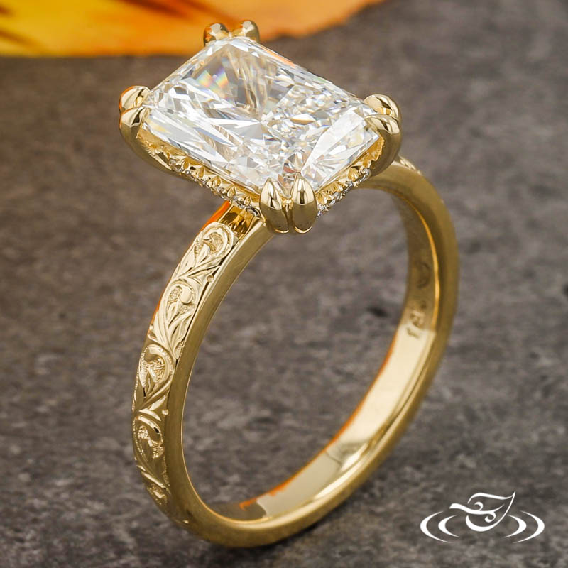Custom 18kt yellow gold ring holding (1) GLJW provided radiant lab diamond center stone 4-prong set with split pointed prongs. A total of (20) GLJW provided round cut lab diamond melee are fishtail set around the hidden halo. This ring has a round domed shank with hand engraved scroll patterning accenting the entire top face. All with a high polish finish.