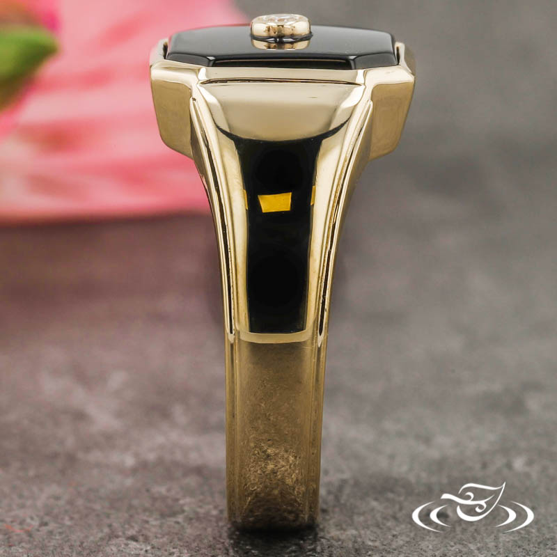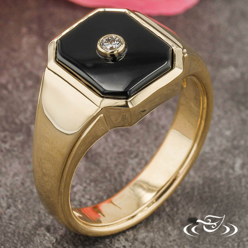 Custom 14kt yellow gold signet style ring holding (1) bezel set emerald shaped black onyx center stone. A drilled hole in the center of the onyx holds (1) 14k yellow gold bezel with (1) GLJW provided round cut diamond melee. This ring has tapering shoulders with a recessed groove eternity style along the top face near each edge. All with a high polish finish.