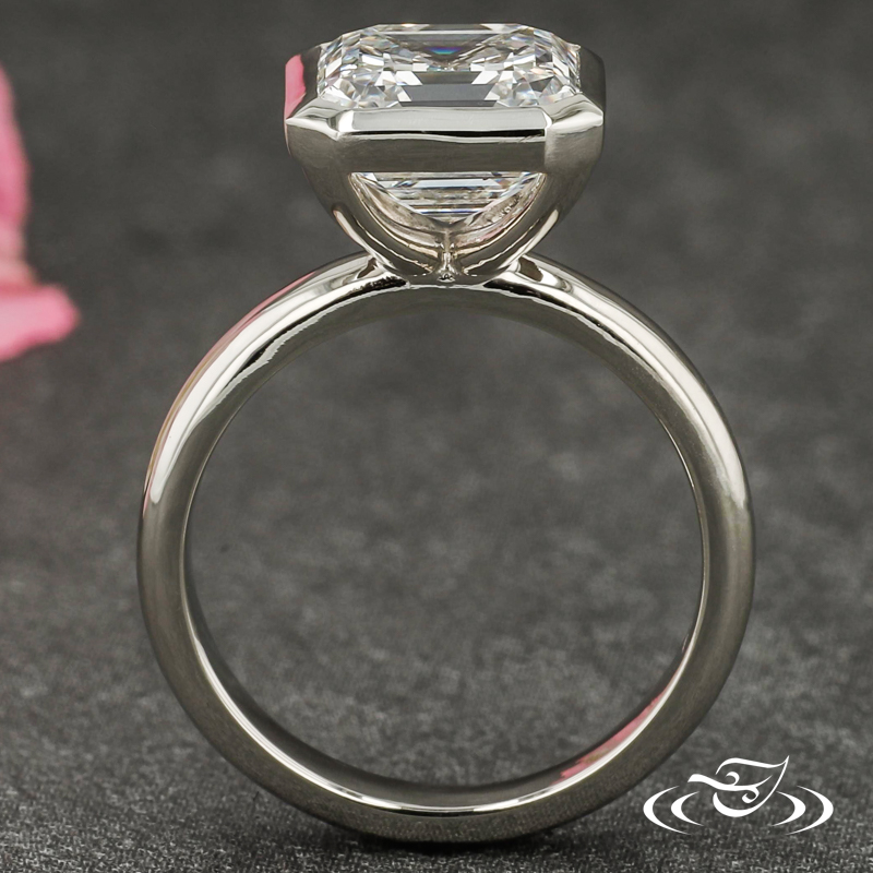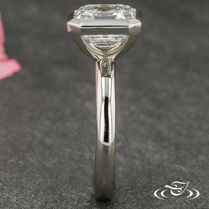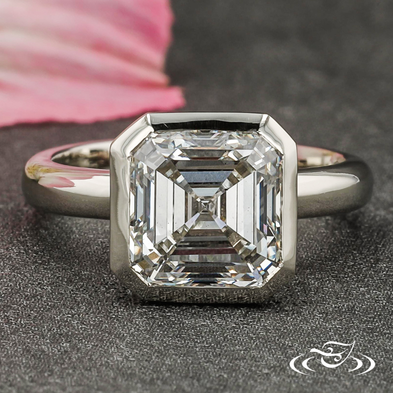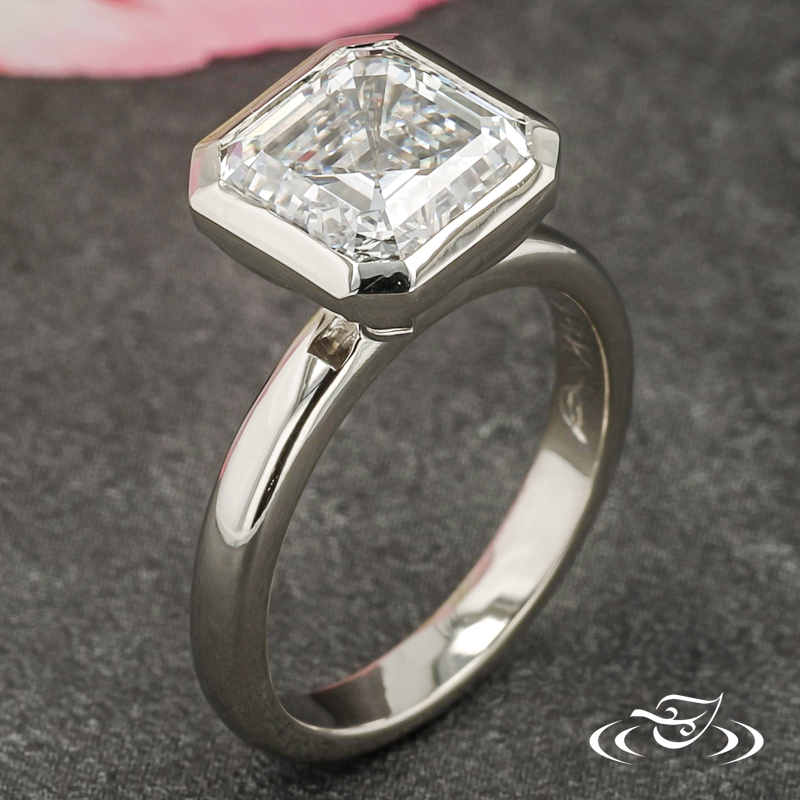 Custom 14kt white gold solitaire ring holding a bezel set GLJW provided asscher lab diamond center stone. This ring also has a round shank and a high polish finish.