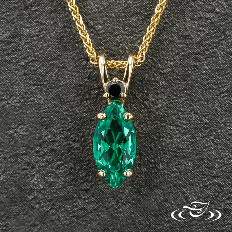 Custom 14k yellow gold pendant featuring (1) 4-prong set GLJW provided lab marquise emerald with (1) 3-prong set GLJW provided round black diamond above it. Pendant has rabbit ear bail at top center and plate on back is engraved in script font "Gabby". All with high polish finish. Strung onto GLJW provided chain purchased under job 220771.