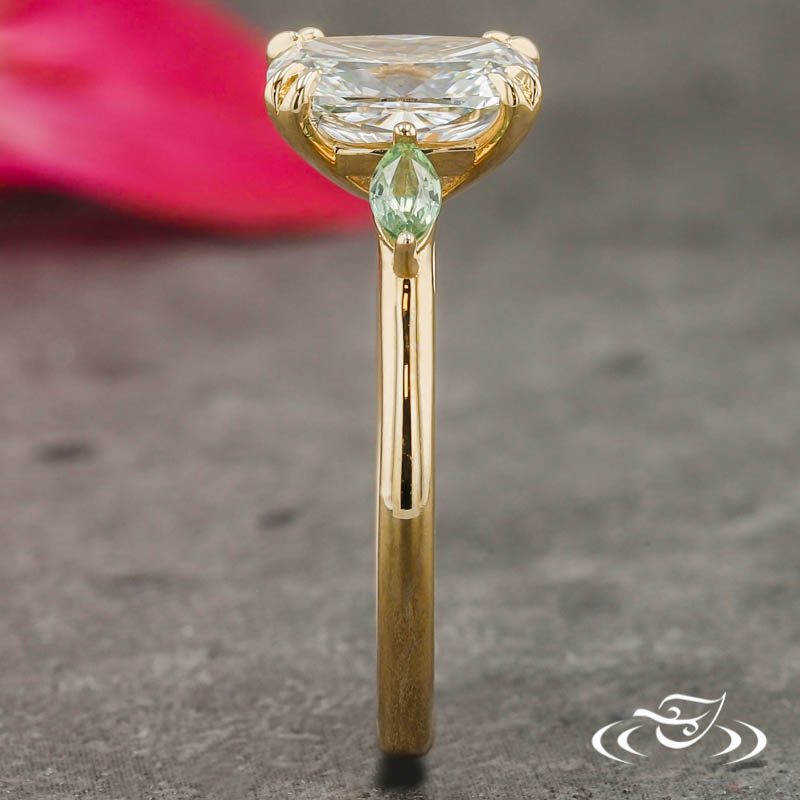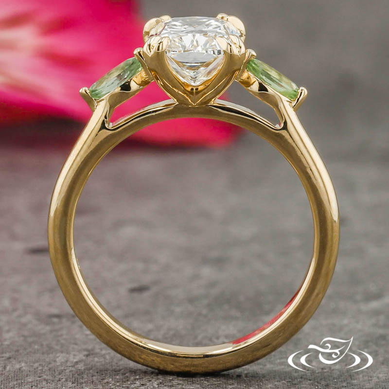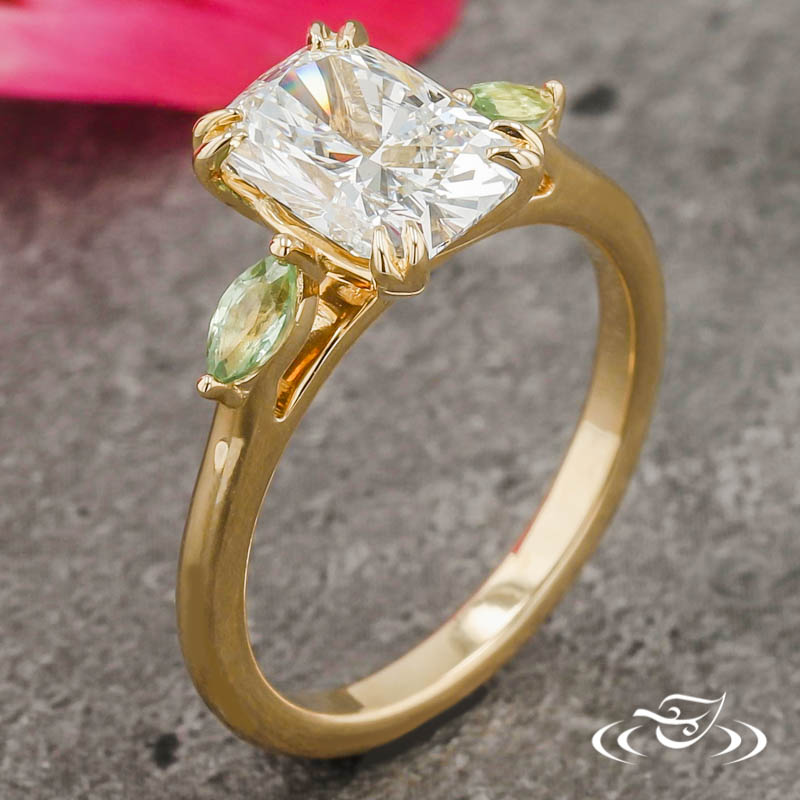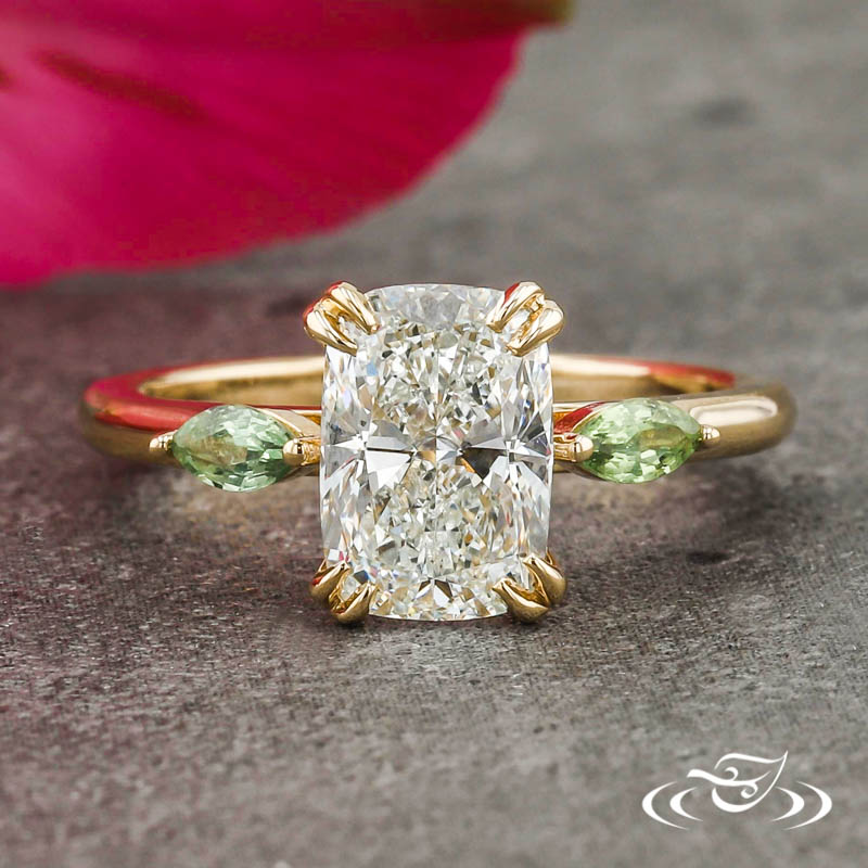 Custom 14kt yellow gold ring holding (1) GLJW provided cushion cut lab diamond center stone 4-prong set with split pointed prongs. Flanking the center setting are (2) 2-prong set GLJW provided marquise cut green sapphire accent stones. This ring has a round softly domed profile and a high polish finish.