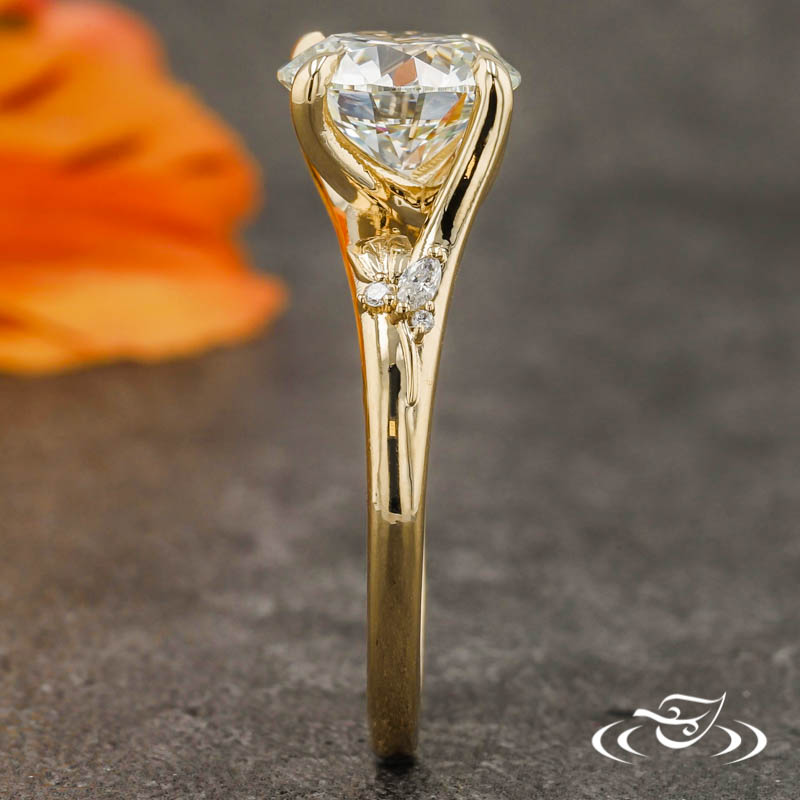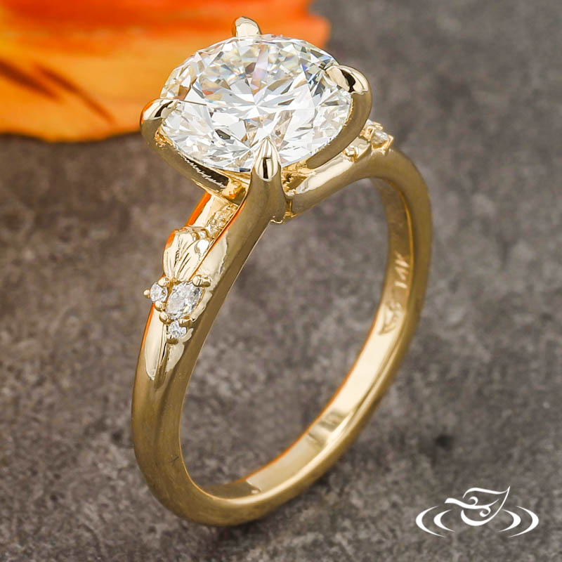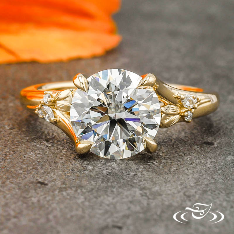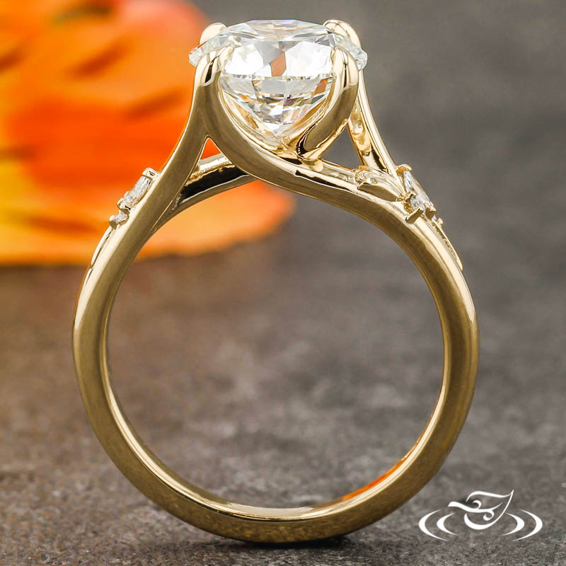 Custom 14kt yellow gold ring with a pronounced crisscross trellis design holding (1) GLJW provided round cut lab diamond center stone 4-prong set with pointed prongs. The split shoulders are formed from the trellis design and taper to form a singular round domed band. On each shoulder sits (1) cast-in-place raised rose with hand engraved petal detailing. Forming leaf-inspired elements on the stem of each rose are (2) micro-prong set GLJW provided round cut lab diamond melee and (1) micro-prong set GLJW provided marquise cut lab diamond melee. All with a bright high polish finish.